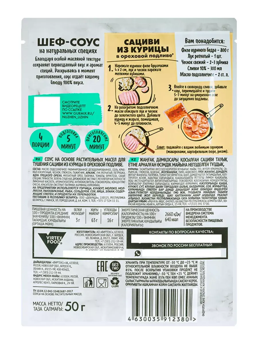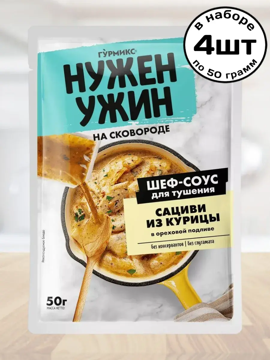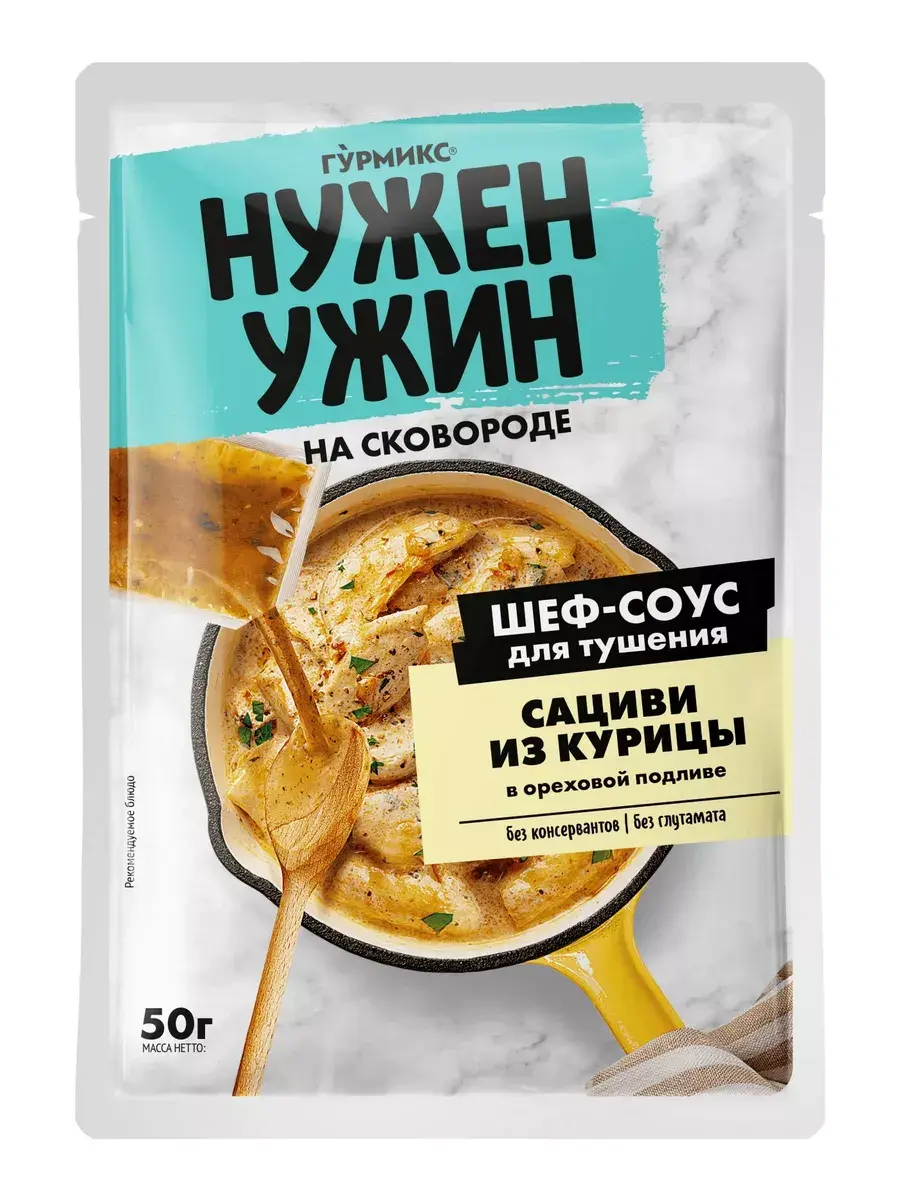 Вы когда-нибудь мечтали о вкусном, домашнем ужине, который был бы одновременно быстрым и легким в приготовлении? ГУРМИКС представляет идеальное решение — Шеф-соус для тушения сациви из курицы "НУЖЕН УЖИН". Теперь вы можете наслаждаться изысканным грузинским блюдом, не выходя из дома! Благодаря особой масляной текстуре сохраняет первозданный вкус и аромат специй. Раскрываясь в момент приготовления, соус отдаёт вашему блюду 100% вкуса. Одна упаковка рассчитана на 4 порции. Способ приготовления: Нарежьте куриное филе брусочками 4 х 2 см, лук и чеснок нарежьте мелкими кубиками. На разогретом подсолнечном масле обжарьте лук и чеснок до золотистого цвета. Добавьте курицу и жарьте, помешивая, 4–5 минут до готовности. Влейте в сковороду сливки, добавьте соус, перемешайте и тушите 5–7 минут на умеренном огне до загущения подливы.