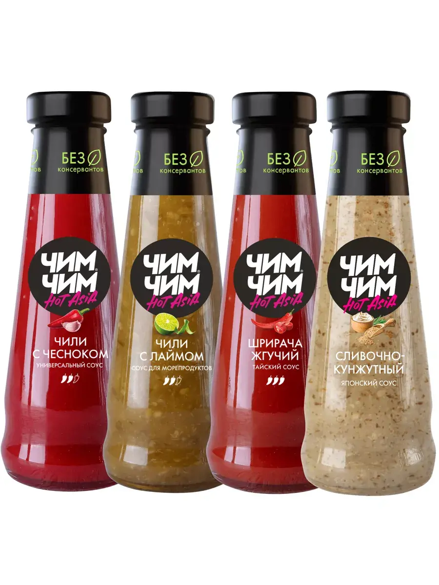 Соус Чили с чесноком — классический азиатский соус умеренной остроты. Сочетание чили, чеснока, экзотических нот тигровой груши и ананаса. Добавит остроты любому блюду. Соус Чили с лаймом — жгучий перец халапеньо, лайм и чеснок. Освежающий соус для рыбы и морепродуктов. Соус Шрирача тайский — пронзительно огненный острый вкус на основе пасты чили и чеснока. Подходит для приготовления пикантного мяса или рыбы. Соус Сливочно-кунжутный — сочетание яркого вкуса обжаренного кунжута с солодово-ореховыми нотками соевого соуса, экстрактом грибов шиитаке и обволакивающими сливками. Соус с настоящим вкусом умами дополнит водоросли Чука, роллы, поке, блюда из рыбы и запечённых овощей. В комплекте ассорти 4 соуса по 210г.