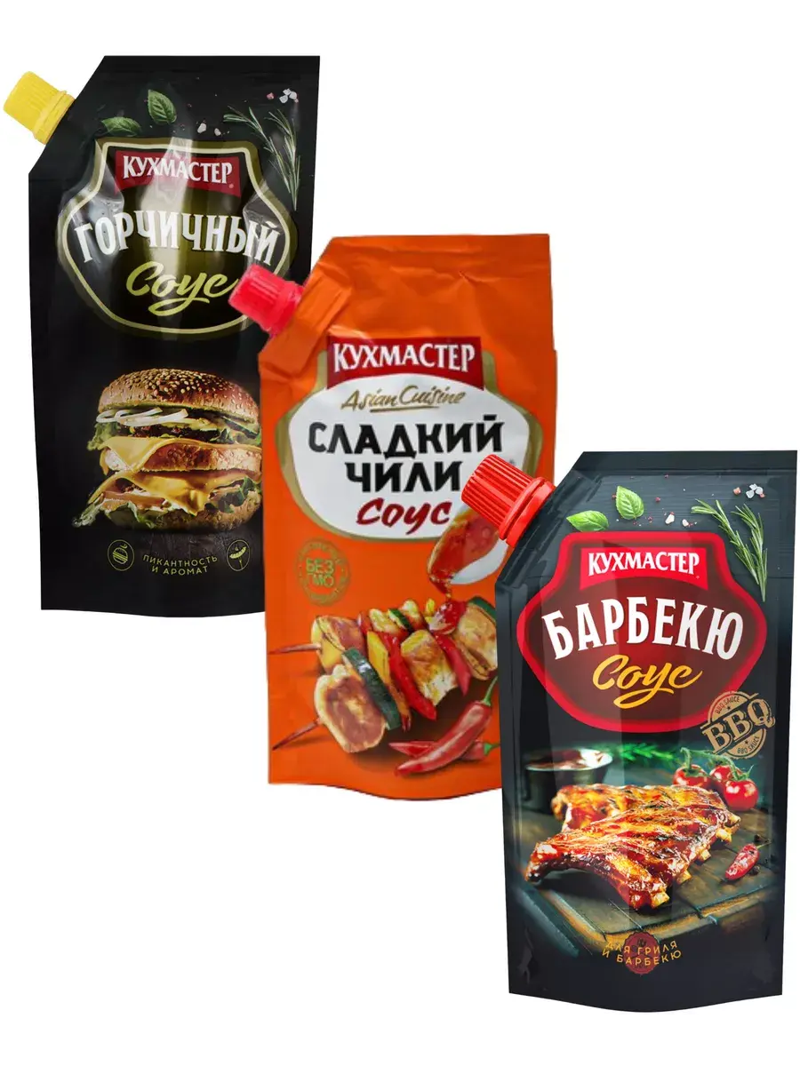 В наборе 3 соуса ассорти: Горчичный 260г; Сладкий Чили 230г; Барбекю 260г.