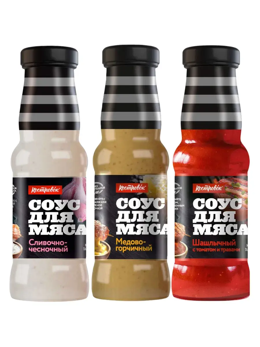 Сливочно-чесночный соус Костровок отличается нежной текстурой с вкраплением кусочков чеснока и приятной сливочностью, благодаря чему этот соус можно назвать универсальным. Этот соус подойдет не только к мясу, он станет отличным дополнением к морепродуктам, рыбе, овощам. Насыщенный вкус горчицы и сладости меда в медово-горчичном соусе сливаются в гармоничное сочетание, которое прекрасно подойдет для любого вида мяса. Слегка сладковатый и в меру острый и пряный, с приятным ароматом горчицы. Идеально подойдет и для мяса, и для салатов и для морепродуктов. Томаты, острый перец, свежий лук, чеснок и кинза - беспроигрышная композиция вкуса в шашлычном соусе с томатом и травами, без которого не обойдется теперь ни один пикник. В соусе вы почувствуете кусочки перца, свежего лука и мякоти томатов. Этот соус свежий и текстурный, словно только вышел из под ножа повара. В наборе 3 соус ассорти.