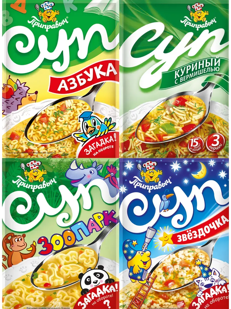 Супы быстрого приготовления «азбука», "зоопарк" и "звездочка" разработаны специально для детей. Яркая упаковка порадует ребенка своим красочным видом и создаст ощущение праздника! А лапша выполненная в виде букв, зверушек и звездочек сделает его обед, ужин или завтрак более веселым и интересным! А также на обороте Вы найдете интересные загадки для своего ребенка! Знакомый с детства мягкий вкус вермишели на курином бульоне - это куриный суп быстрого приготовления с вермишелью, главным достоинством которого является простота в приготовлении. Суп быстро варится – всего 15 минут и готово. Одна пачка супа рассчитана на три порции. В комплекте ассорти супов 4 штуки по 60г.