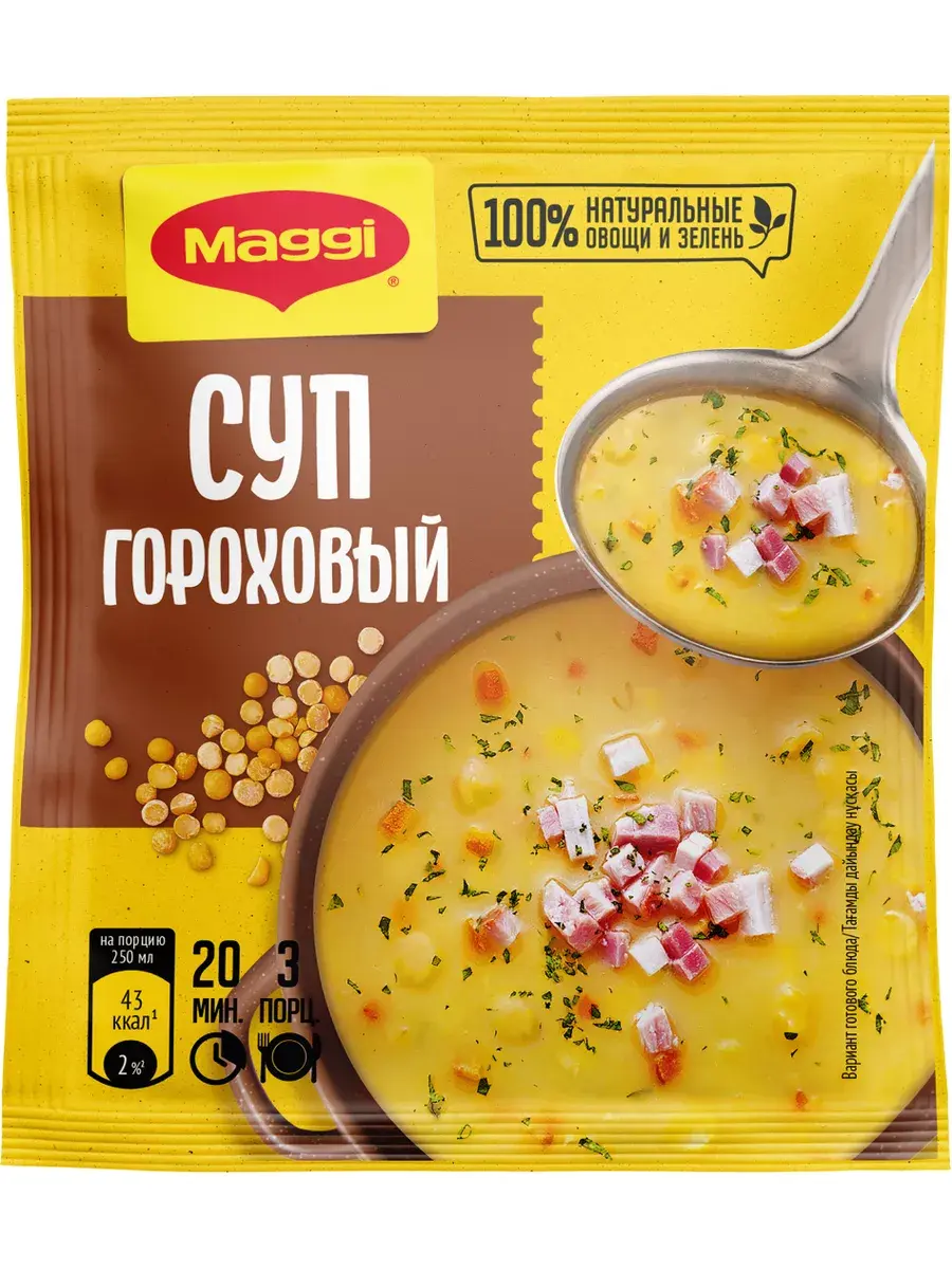 Гороховый суп один из самых любимых супов в нашей стране, но его приготовление требует времени. MAGGI Суп гороховый – это только знакомые ингредиенты для приготовления полноценного супа: половинки гороха не требующие длительной варки, гороховая мука, сушеные овощи, зелень и ароматные специи. Вы можете приготовить гороховый суп MAGGI как самостоятельное первое блюдо или сделать его основой наваристого домашнего супчика — результат будет великолепен в любом случае. Как приготовить: