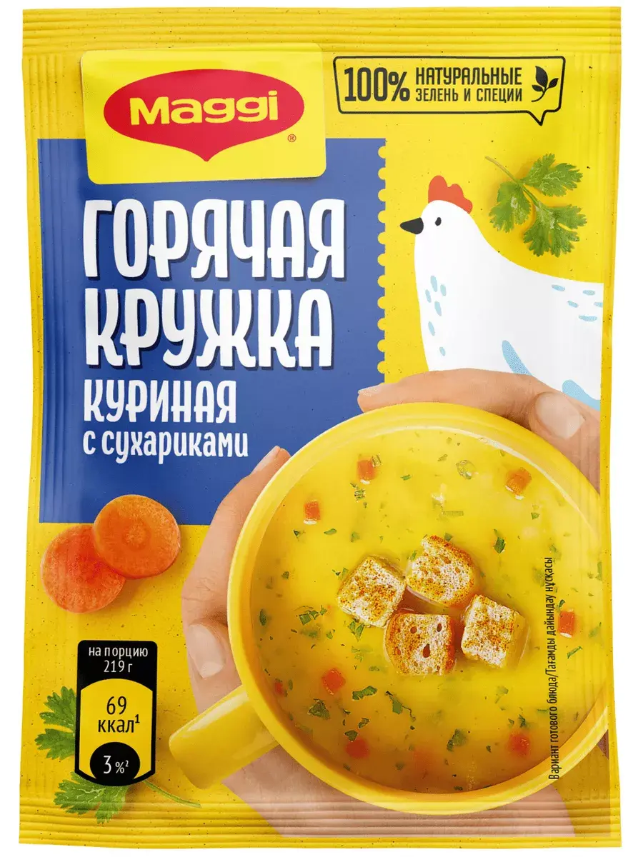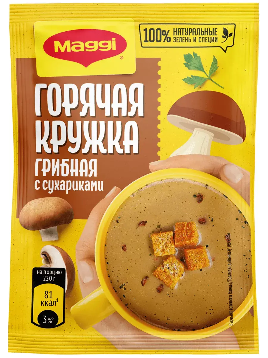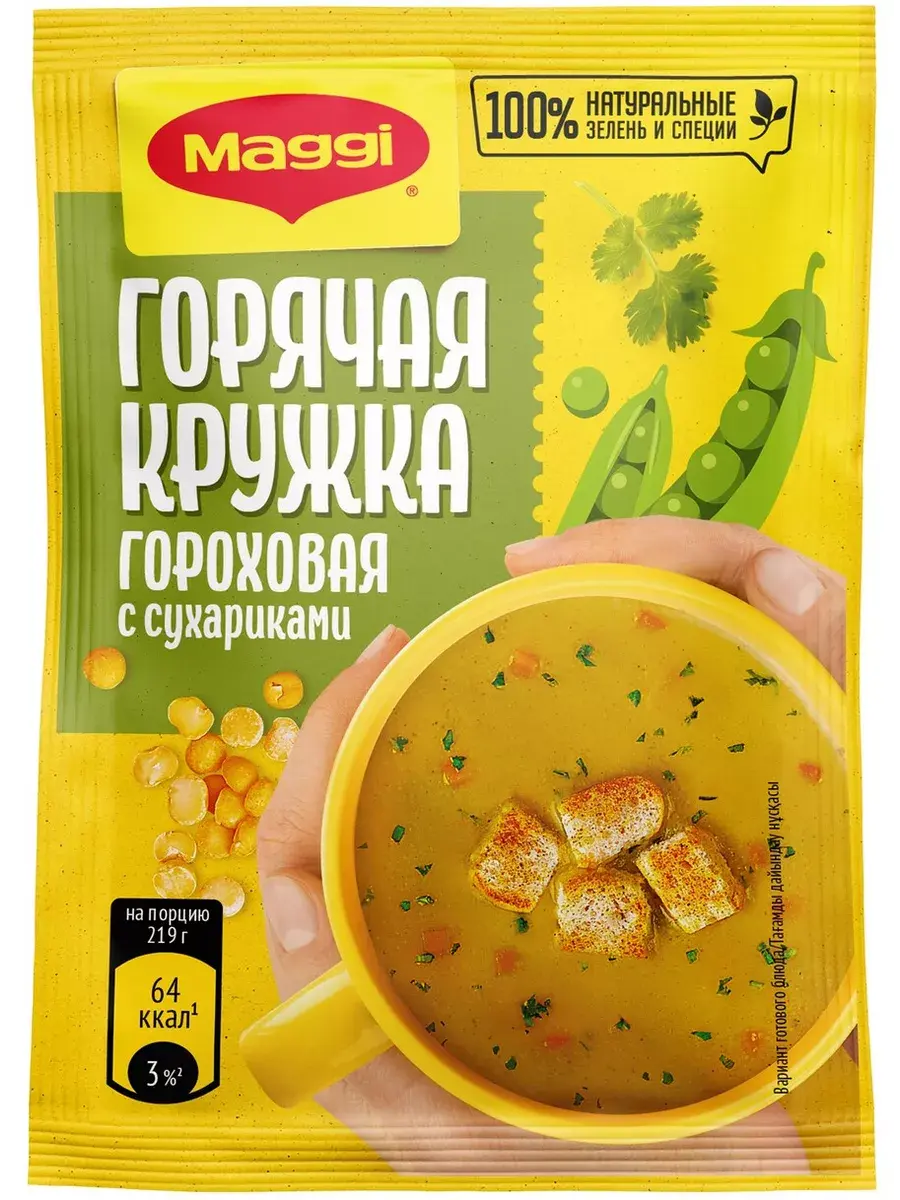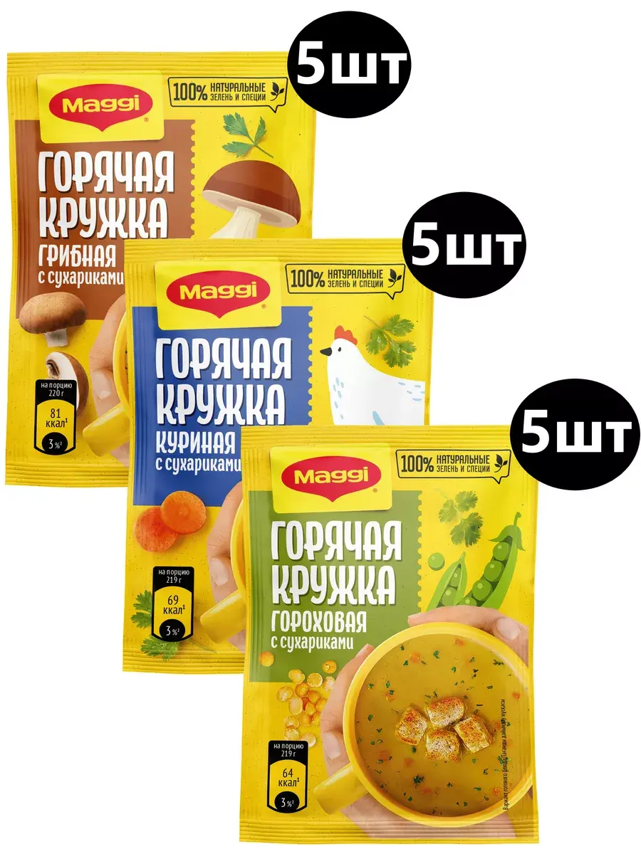 MAGGI Горячая кружка грибная, куриная и гороховая в составе которых кусочки натуральных овощей, душистых трав и специй обладают насыщенным грибным, куриным, гороховым вкусом и ароматом, в сочетании с хрустящими сухариками прекрасно утолит голод и согреет вас в любой ситуации. Не содержит консервантов. Перекус – полноценная часть сбалансированного рациона наряду с завтраком, обедом и ужином. Горячие кружки MAGGI помогут Вам приготовить вкусный и ароматный горячий перекус, где бы Вы не находились. В комплекте 5 штук каждого вида.
