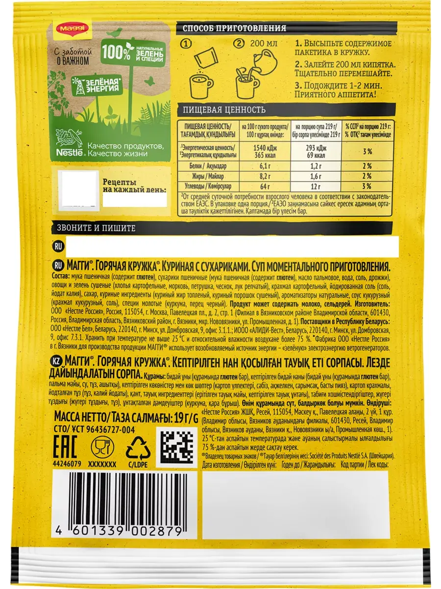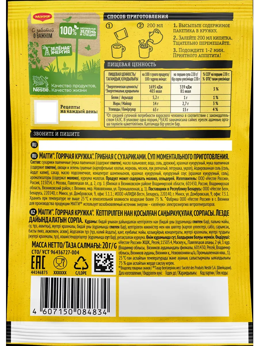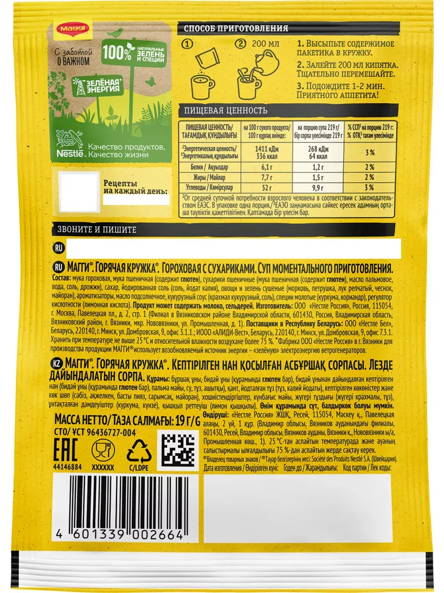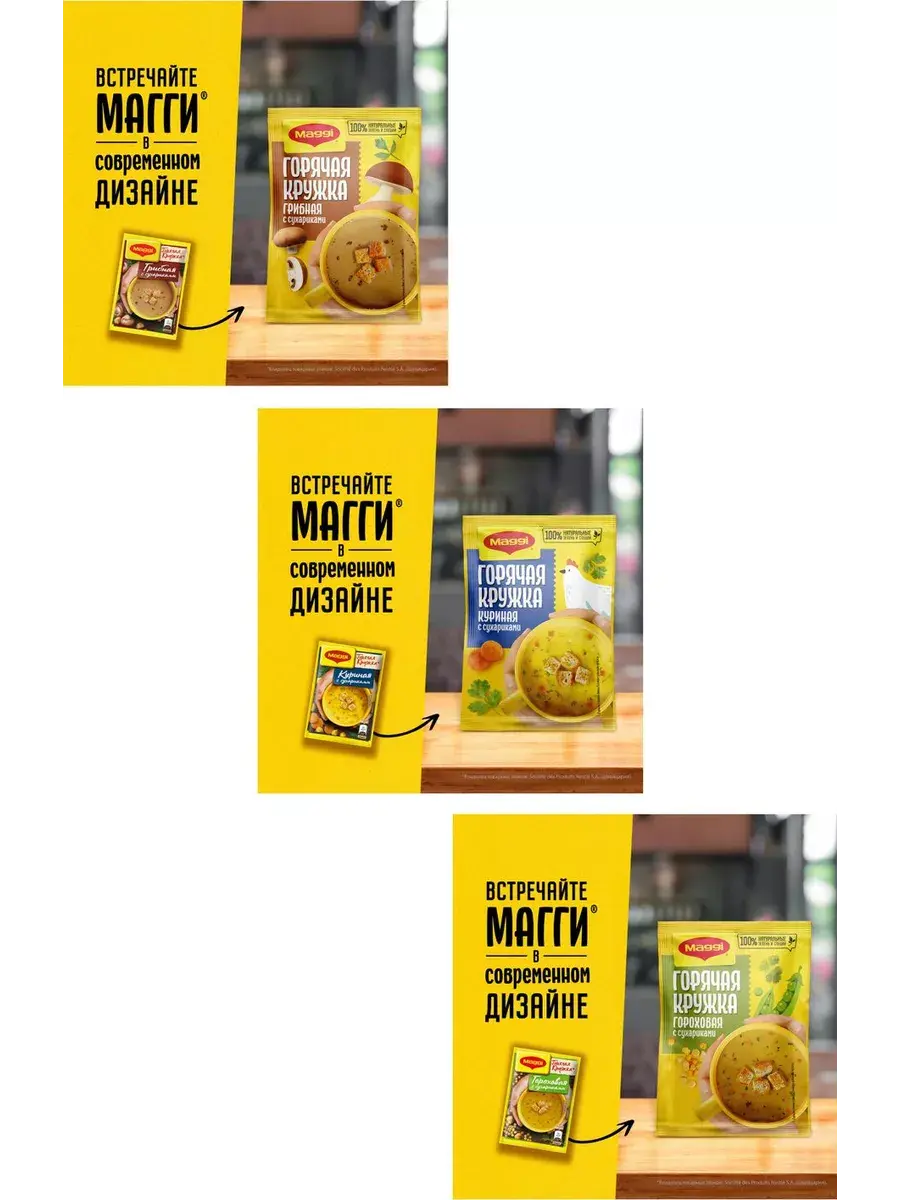 MAGGI Горячая кружка грибная, куриная и гороховая в составе которых кусочки натуральных овощей, душистых трав и специй обладают насыщенным грибным, куриным, гороховым вкусом и ароматом, в сочетании с хрустящими сухариками прекрасно утолит голод и согреет вас в любой ситуации. Не содержит консервантов. Перекус – полноценная часть сбалансированного рациона наряду с завтраком, обедом и ужином. Горячие кружки MAGGI помогут Вам приготовить вкусный и ароматный горячий перекус, где бы Вы не находились. В комплекте 5 штук каждого вида.