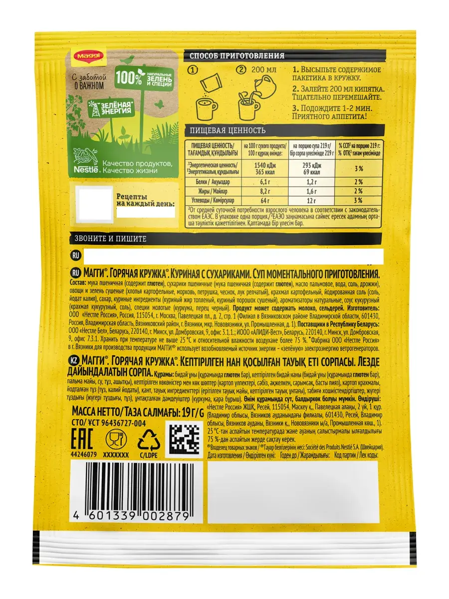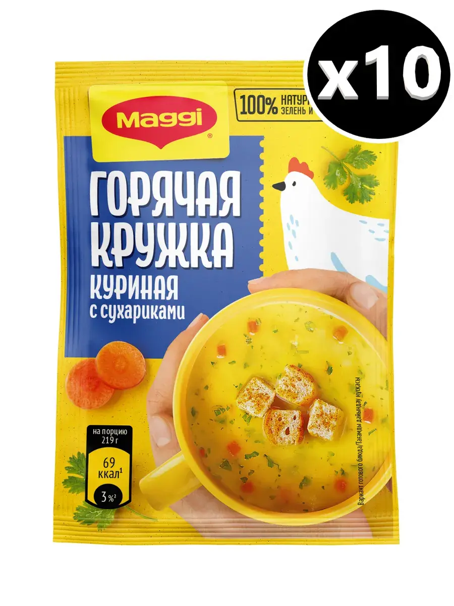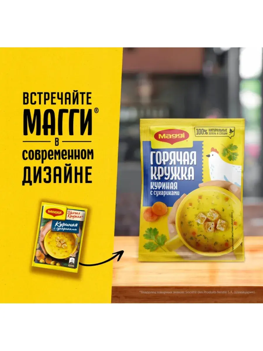 Что может быть лучше порции теплого бульона в обеденный перерыв? Только MAGGI Горячая кружка куриная с хрустящими сухариками. Это суп моментального приготовления, который вы легко сделаете за пару минут абсолютно в любом месте: в офисе, на учебе или даже в путешествии. В состав смеси входят кусочки натуральных овощей — морковь, картофельные хлопья, петрушка, чеснок и лук, — а также душистые травы и специи, которые придают первому блюду тот самый аппетитный аромат. Как приготовить?