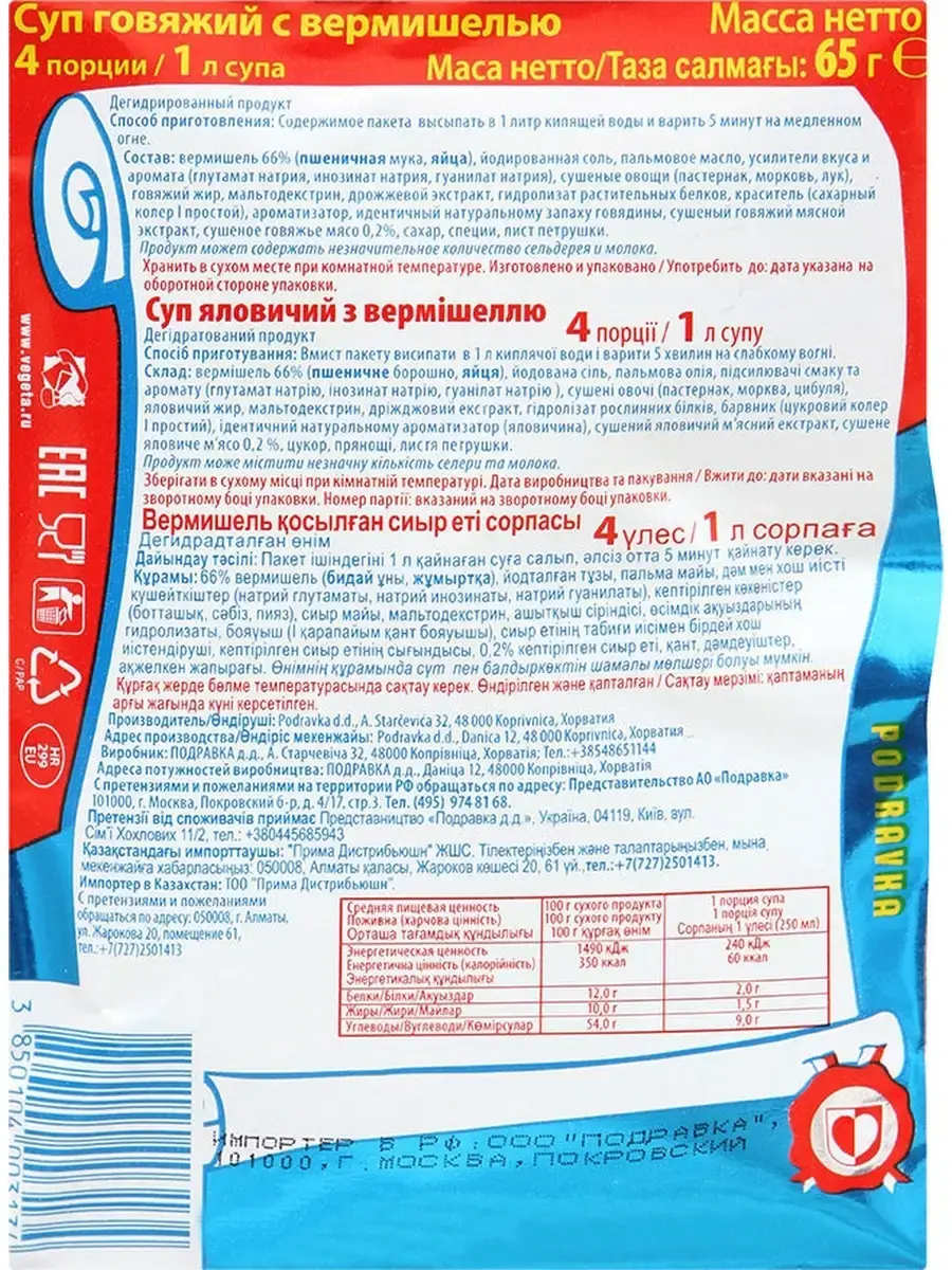 Состав: вермишель, йодированная соль, гидрогенизированный растительный жир, усилитель вкуса и аромата, говяжий жир, сушеные овощи (пастернак, морковь, лук), сахар, дрожжевой экстракт, гидролизат растительных белков, краситель, ароматизатор, идентичный натуральному запаху говядины, сушеный говяжий мясной экстракт, сушеное говяжье мясо, специи, лист петрушки, мальтодекстрин.Срок годности 24 мес.