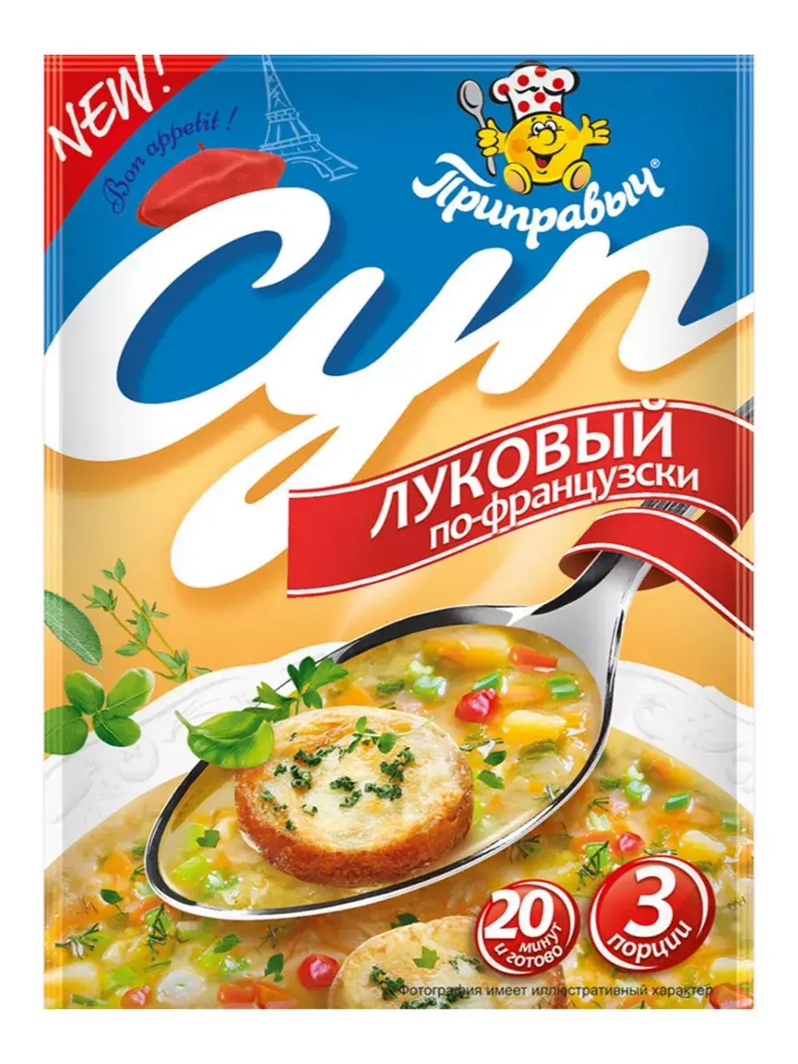 Луковый суп - один из самых известных супов национальной французской кухни! Он предлагается большинством ресторанов Парижа. В XVII столетии лук был пищей для бедных семей. Тогда луковый суп готовился из корки сухого хлеба или гренок, бульона, говядины и слегка обжаренной или целой головки лука. В наборе 5 индивидуальных упаковок по 50 грамм.