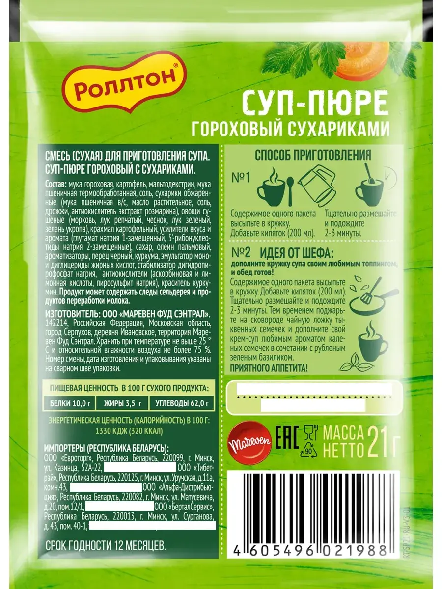 Кто сказал, что вкусно и быстро перекусить или дополнить свой обед невозможно? Супы быстрого приготовления «Роллтон» в удобной упаковке — отлично подходят! Легкий обед можно устроить в любой момент. Взял его с собой на работу, залил кипятком, несколько минут и нежный супчик с сухариками готов. Не забудь захватить кружку или термос. Приятного аппетита! Способ приготовления: Содержимое одного пакета высыпьте в кружку. Добавьте кипяток (200 мл). Тщательно размешайте и подождите 2-3 минуты. В наборе 2 пакетика ассорти вкусов.