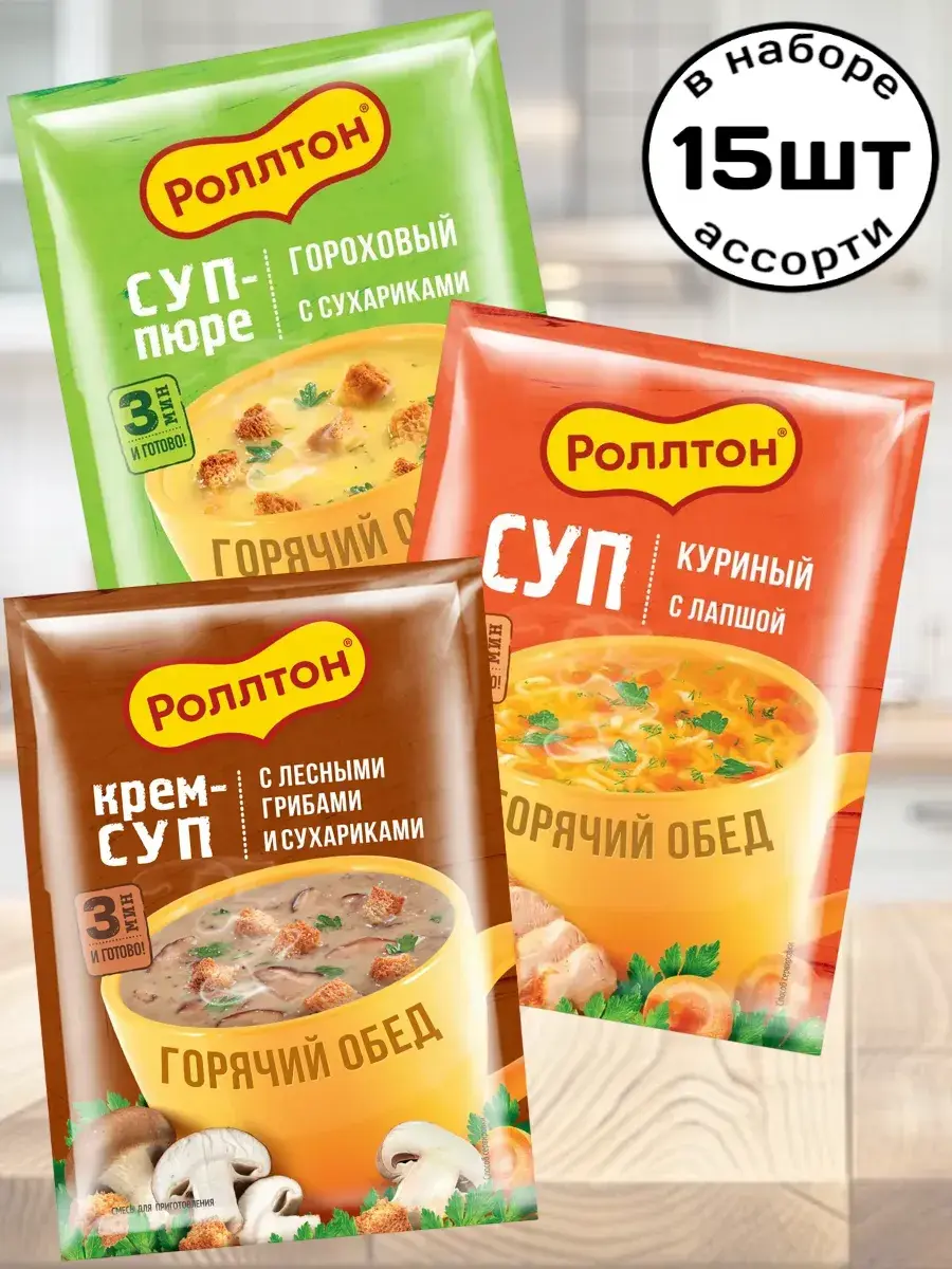 Кто сказал, что вкусно и быстро перекусить или дополнить свой обед невозможно? Супы быстрого приготовления «Роллтон» в удобной упаковке — отлично подходят! Легкий обед можно устроить в любой момент. Взял его с собой на работу, залил кипятком, несколько минут и нежный супчик с сухариками готов. Не забудь захватить кружку или термос. Приятного аппетита! Способ приготовления: Содержимое одного пакета высыпьте в кружку. Добавьте кипяток (200 мл). Тщательно размешайте и подождите 2-3 минуты. В наборе 15 пакетиков ассорти вкусов.