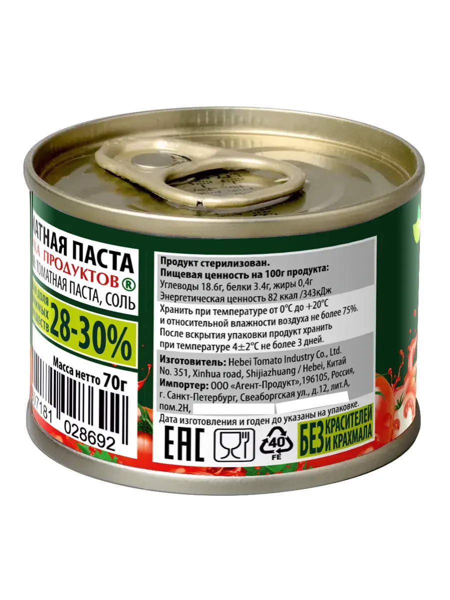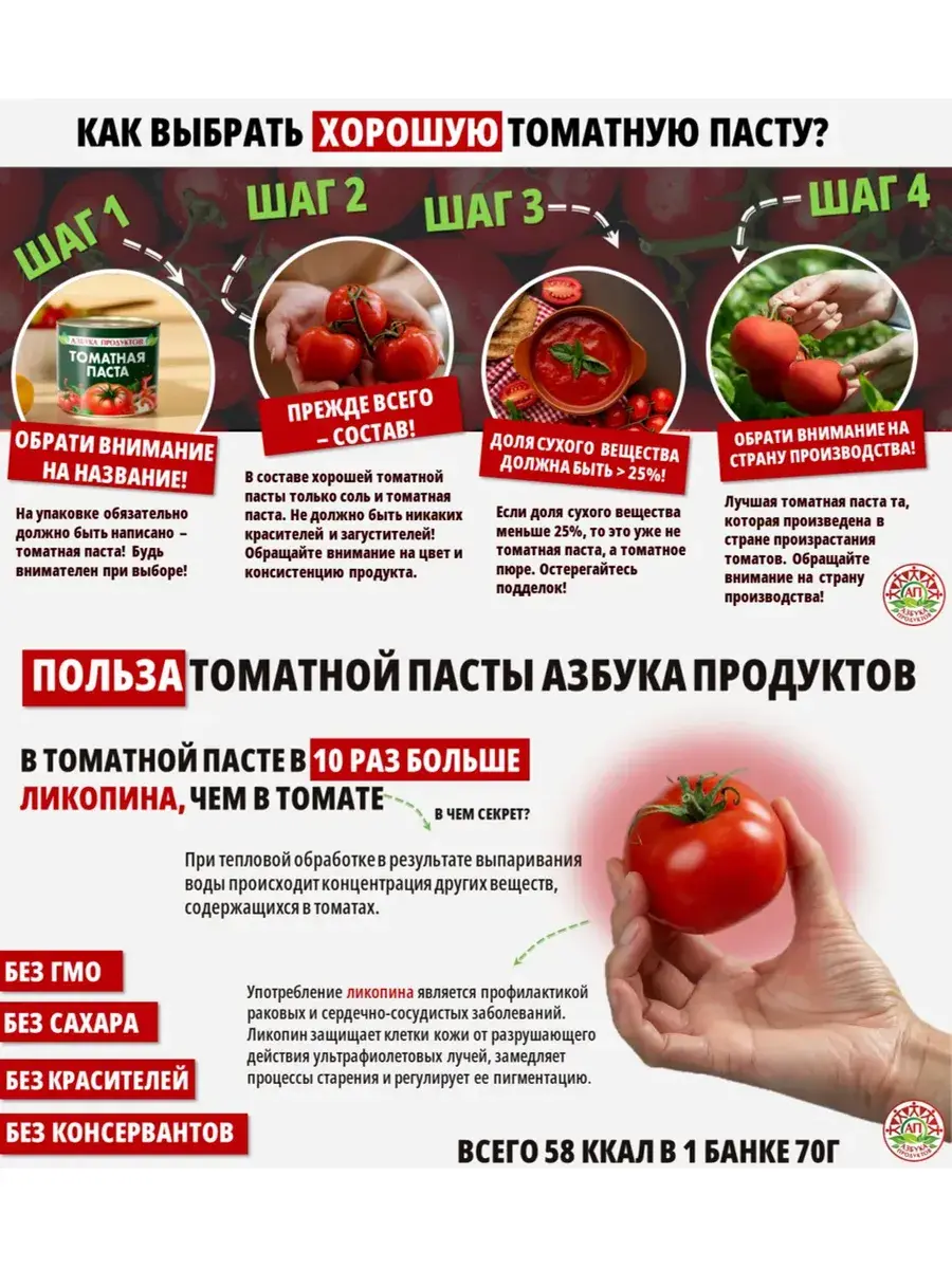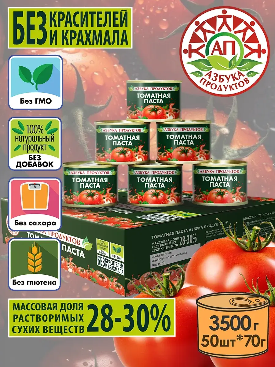 Томатная Азбука Продуктов состоит из отборных томатов — только свежие сочные помидорки, немного соли и ничего больше! Без красителей. Без крахмала. Без глютена. Без сахара. Без гидрогенизированных масел и трансжиров. Без холестерина. Без ГМО. Без консервантов. Незаменима для приготовления полезных и вкусных блюд. Важный компонент веганских диет и правильного питания. Не содержит продуктов животного происхождения. Имеет удобный ключ для открывания баночки. Томатная паста содержит витамины группы В, С, А, К, Е, калий, магний, железо, кальций, селен, натрий, цинк и