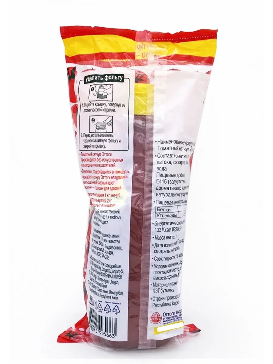 "Оттоги" создан в Южной Корее из отборных спелых томатов — на каждый килограмм кетчупа уходит до 2 кг свежих помидоров. Без искусственных красителей и консервантов — только настоящие ингредиенты и капля азиатского мастерства. Идеален к картофелю, мясу, пасте и любимым корейским блюдам. Богат ликопином — мощным природным антиоксидантом. Удобная упаковка — легко использовать, удобно хранить. Перед использованием нужно: Открыть крышку, повернув её против часовой стрелки. Удалить защитную фольгу и закрыть крышку.