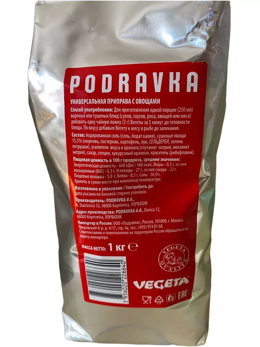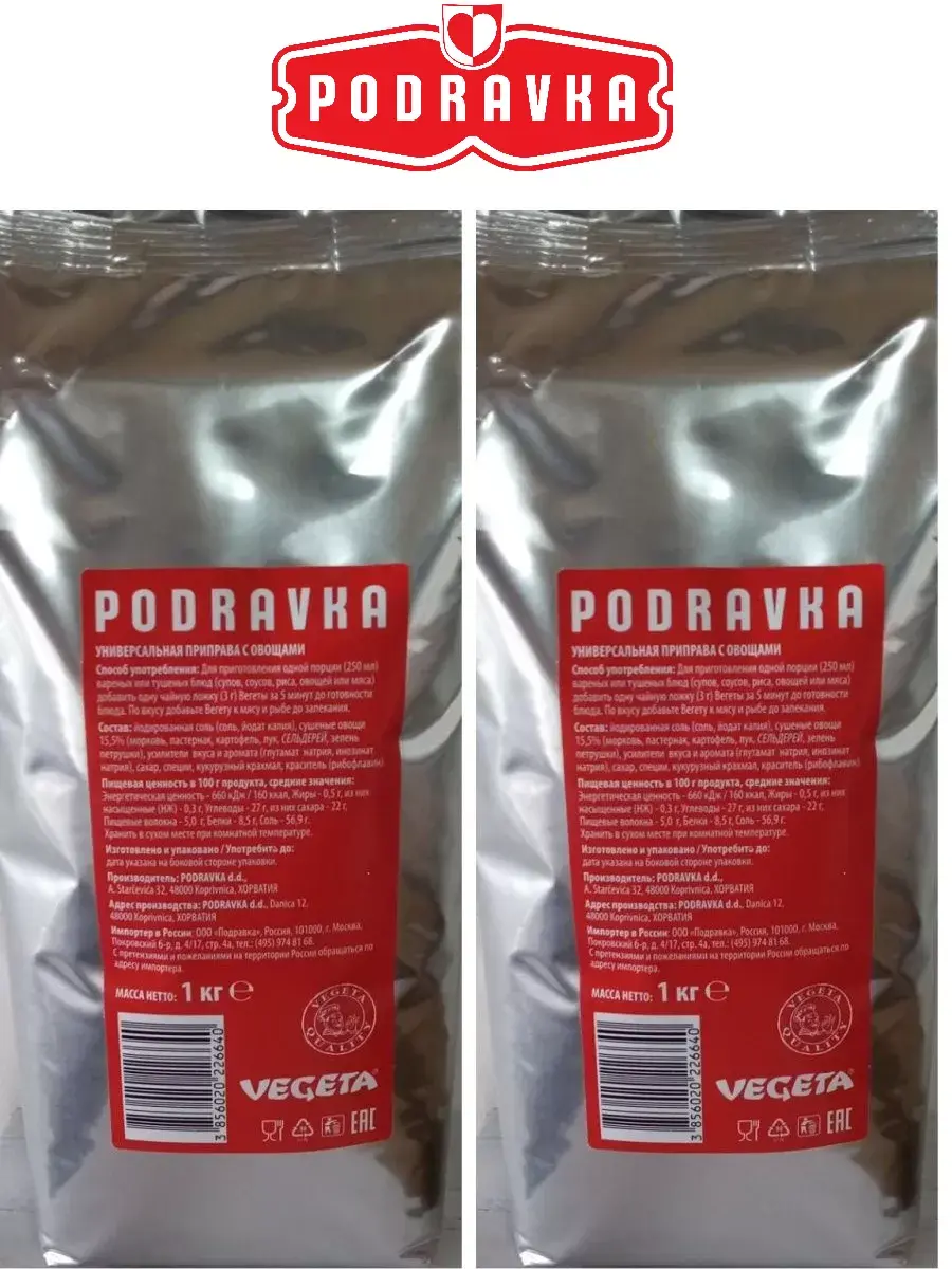 Область применения этой комбинации сушеных овощей и специй не ограничена. Это могут быть и минималистские блюда, и блюда из сложных деликатесов - одной чайной ложки приправы Vegeta Podravka всегда достаточно, чтобы почувствовать тонкую разницу. Поэтому, готовя еду, дайте свободу своей фантазии и наслаждайтесь. Оцените богатство овощей в каждом блюде! Вкус на все 100%. Для приготовления одной порции (250 мл) вареных или тушеных блюд (супов, соуса, риса, овощей или мяса) добавить одну чайную ложку (3 г) Вегеты за 5 минут до готовности блюда. По вкусу добавьте Вегету к мясу и рыбе до запекания. В комплекте 2 штуки по 1кг.
