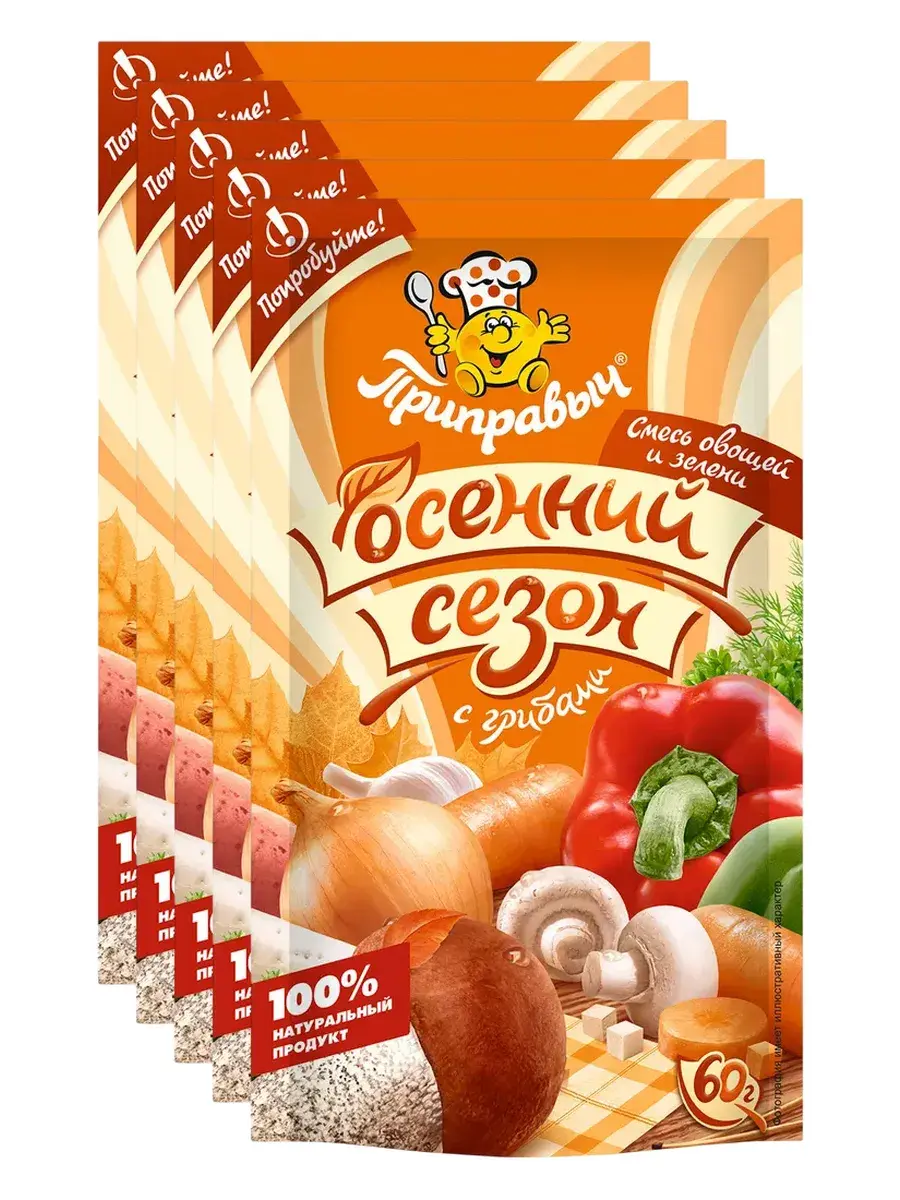 Приправа «Осенний сезон» состоит из смеси сушёных ароматных грибов, овощей и зелени. Она подарит Вашим блюдам вкус щедрого урожая осени, его насыщенный вкус и аромат! Приправа может добавляться в мясные, овощные блюда, супы, запеканки с грибами и другие блюда. Грибы и овощи после сушки сохраняют в себе пользу свежих продуктов, и поэтому полны витаминами и микроэлементами. Овощи нужны человеку в течение всего года, они играют огромную роль в укреплении иммунной системы. Грибы также богаты полезными свойствами. Добавлять приправу следует за 20-25 минут до готовности. В комплекте 5 штук по 60г.