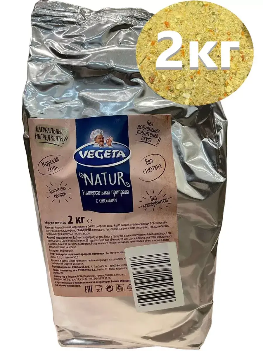 Когда вы заходите на кухню, забудьте о том, что вы чего-то не знаете и довертесь своим чувствам. Позволь вашему воображению стать вашим единственным кулинарным рецептом. Отступи от правил, импровизируй… Вооружись своими знаниями и шагни в неизвестность. Укрепи свою уверенность, положившись на Vegeta, она гарантирует идеальный вкус готового блюда. Когда ты на кухне, Готовь свободно! Vegeta NATUR - это результат отличного сотрудничества природы и высоких технологий. Тайна кроется в большом количестве овощей. Добавить приправу Vegeta Natur в процессе варки или тушения блюда или перед его запеканием. Одной чайной ложки (3 г) достаточно для 250 мл супа или соуса, а также для 250 г салата, макаронных изделий, блюд из риса или картофеля. Рыбу или мясо следует посыпать приправой с обеих сторон. Солить дополнительно не нужно. В комплекте 1 упаковка, весом 2 кг.