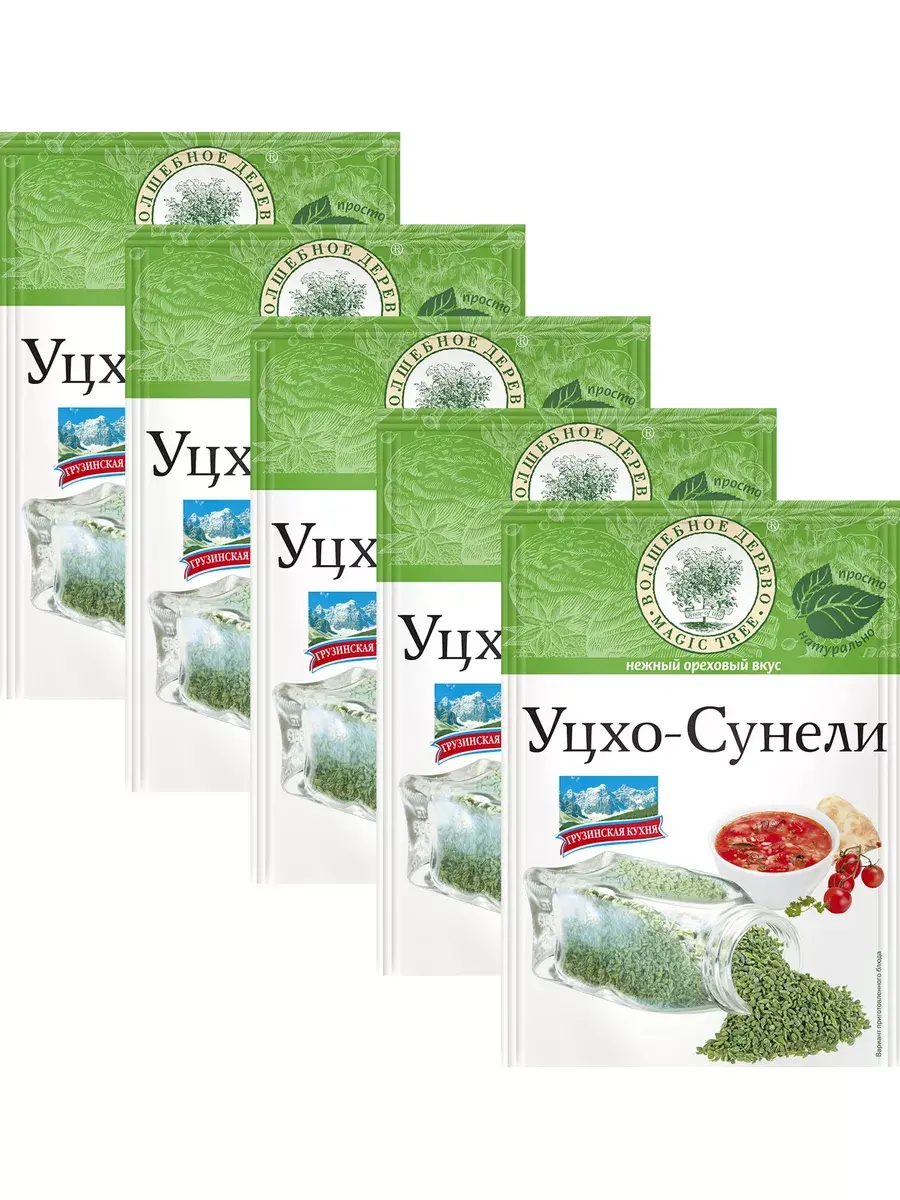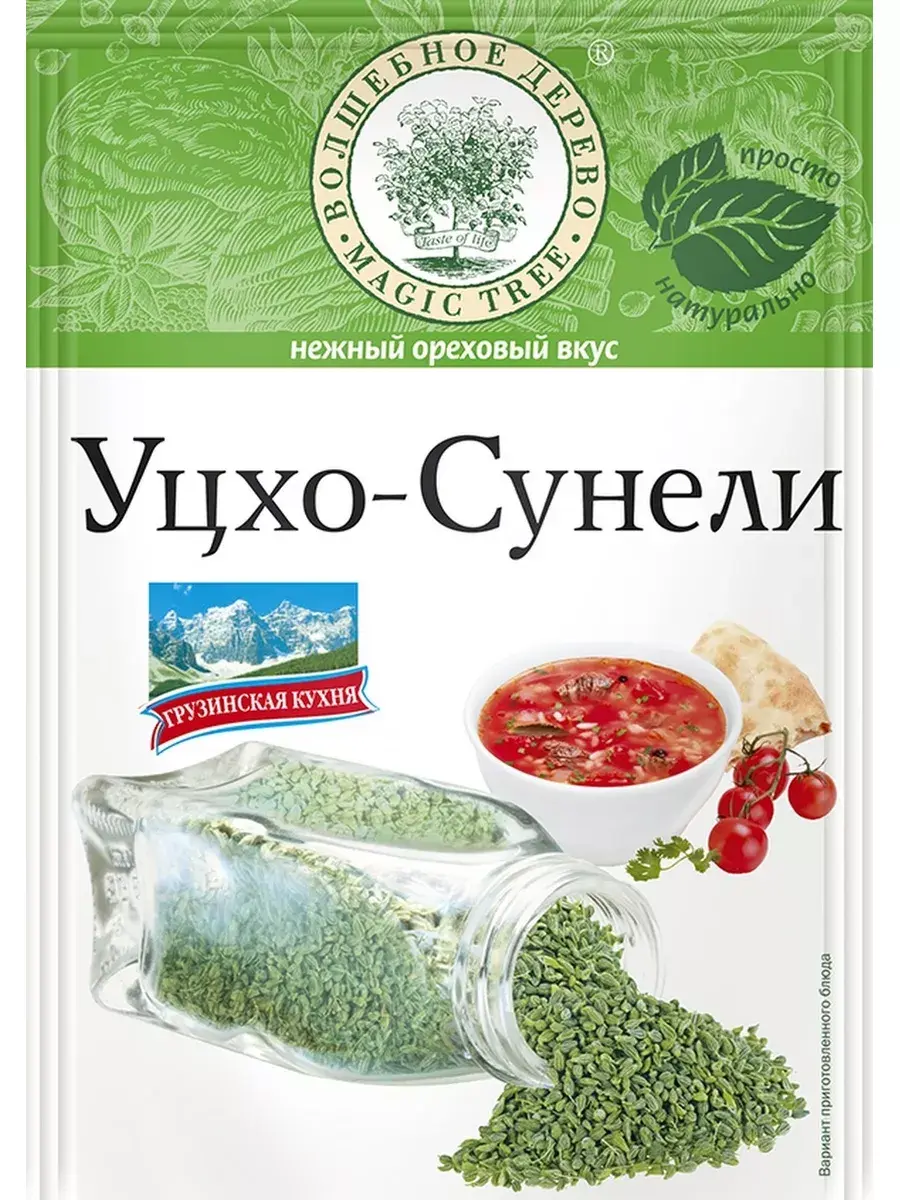 Уцхо-сунели представляет собой смесь сушеных измельченных соцветий, молотых семян и стручков растения голубой пажитник. Уцхо-сунели ингредиент грузинских блюд – аджики, лобио, чахохбили, сацебели, пхали, кебаб. Пряность добавляют в сыры, чтобы придать им уникальный вкус и бледно-зеленый цвет (например, в швейцарский твердый сыр «Шабцигер»). Приправой ароматизируют чай, используют для выпечки хлеба. Это один из компонентов сванской соли, соуса сацебели, приправы хмели-сунели. В комплекте 5 штук по 15г.