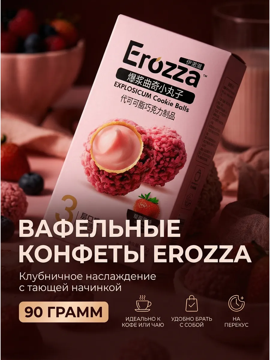 Erozza Explosicum Cookie Balls — это не просто конфеты, а изысканное сочетание текстур, которое влюбляет в себя с первого хруста. Каждый шарик — это три слоя наслаждения: хрустящая внешняя посыпка, тончайшая вафельная сфера и тающая, нежная кремовая начинка в самом сердце.