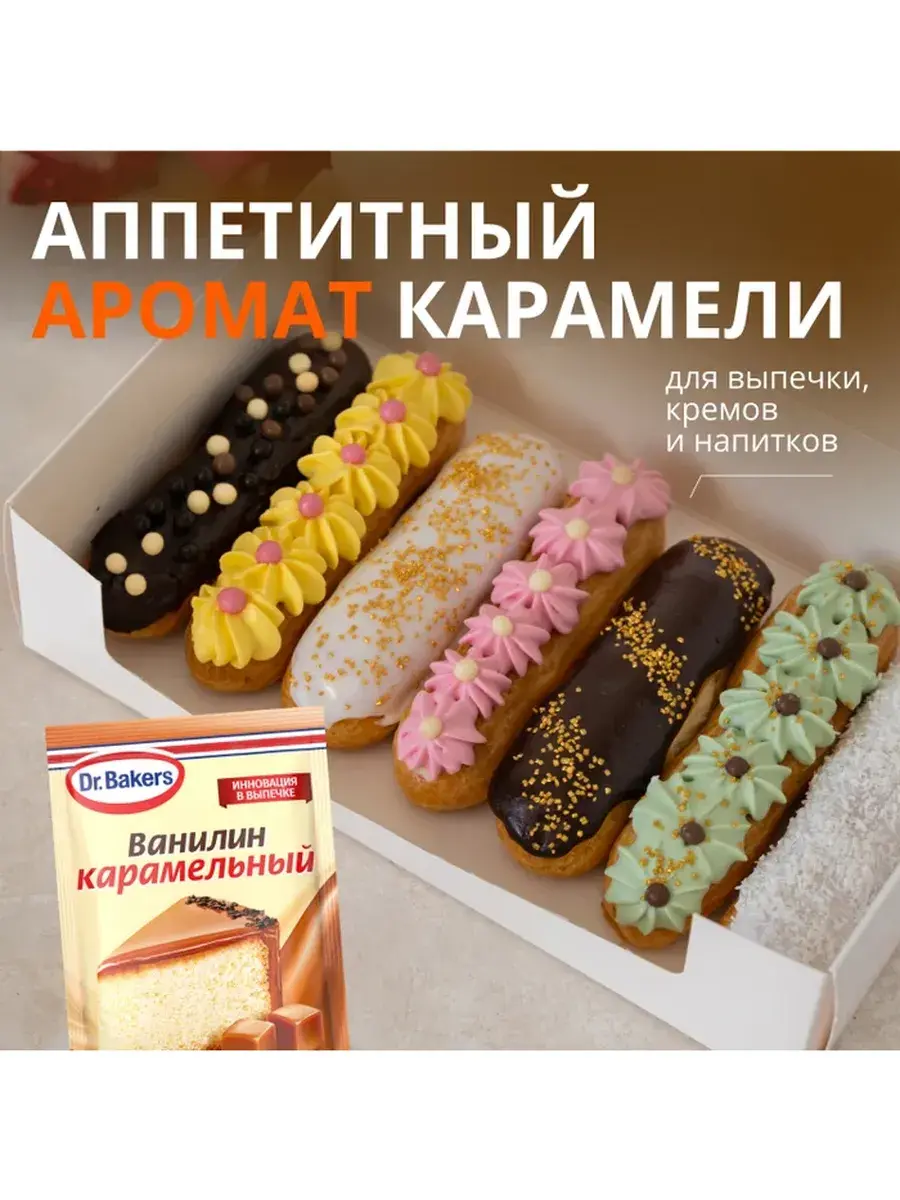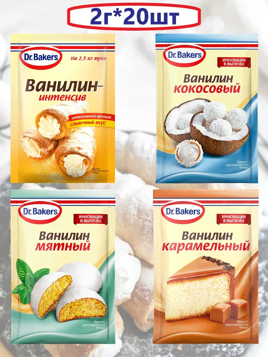 Уникальное сочетание классического премиального ванилина и специально подобранных ароматизаторов с интенсивным вкусом и ароматом. Ингредиент, без которого не обходится приготовление ароматной выпечки. Его добавляют в торты, пирожные, капкейки, пироги и прочие десерты. Благодаря своему тонкому оригинальному вкусу этот секретный компонент делает любую выпечку невероятно аппетитной и соблазнительной, придает ей изысканный сливочно-ванильный аромат. При этом используется он весьма экономично, потому что требуется его совсем немного. 1 пакетик рассчитан на 2,5 кг муки. В наборе 20 штук по 2г, по 5 штук каждого вида.