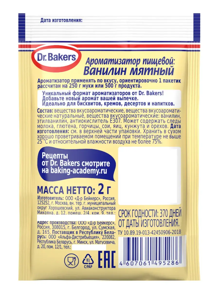 Абсолютная инновация в мире ароматизаторов! «Мятный ванилин» от Dr. Bakers поможет привычной выпечке заиграть по-новому, добавив ей освежающий аромат мяты, оставляющий в послевкусии приятный холодок! Новинка идеально подходит для десертов, выпечки, кремов и напитков. Удобное и быстрое применение – просто добавьте ванилин на этапе смешивания ингредиентов и получите настоящее удовольствие от результата. Индивидуальные пакетики по 2 грамма облегчают расчет рецепта и удобны в домашнем использовании. 1 пакетик рассчитан на 250 гр муки или 500 гр продукта. В комплекте 10 штук по 2г.