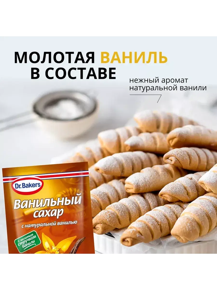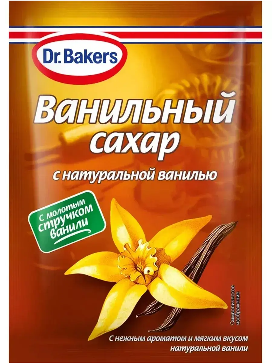 Ванильный сахар Dr.Bakers придает мучным изделиям, коктейлям, кремам, десертам нежный аромат и вкус. В составе содержится сахарный песок и измельченная ваниль. Под воздействием высокой температуры ванильный сахар не утратит своих вкусовых качеств и чарующего аромата. Порошок полностью готов к применению.