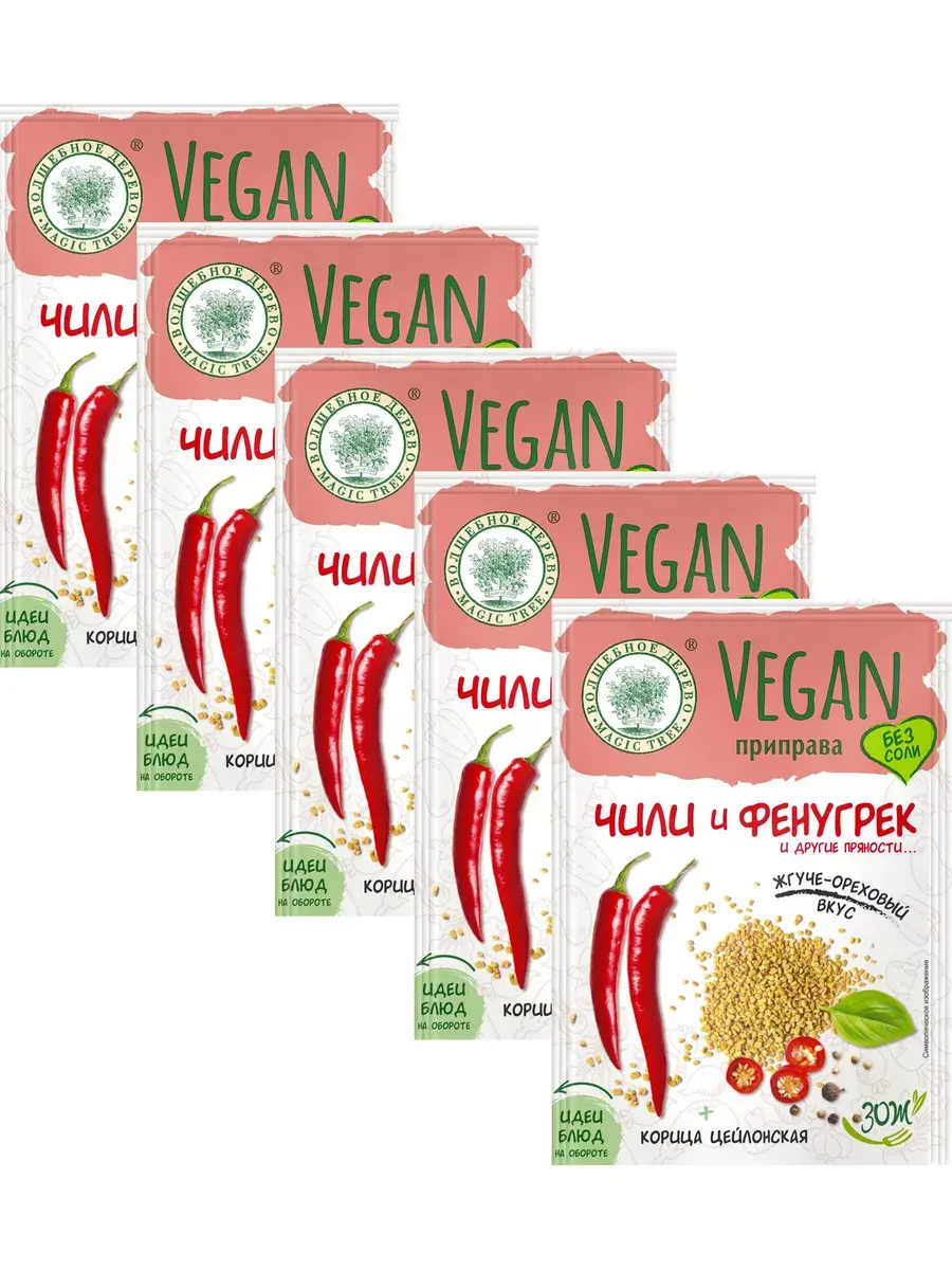 Приправа подходит для разных вегетарианских блюд: теплых салатов, лапши с овощами, овощных рагу, сате, грибов, блюд из киноа, блюд из нута, подливок, соусов. С vegan-приправой Чили и Фенугрек у вас получится неповторимый жгуче-ореховый вкус в приготовлении теплых салатов, блюд из овощей, круп и подлив. Внутри пакетика вас ждет паприка, имбирь, базилик, разнообразие перцев, кориандр и другие специи. Целый букет пряностей и специй, который делает приправу такой душистой и многообразной. В комплекте 5 пакетиков по 22г.