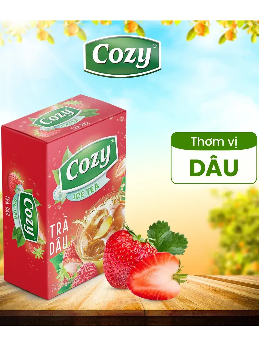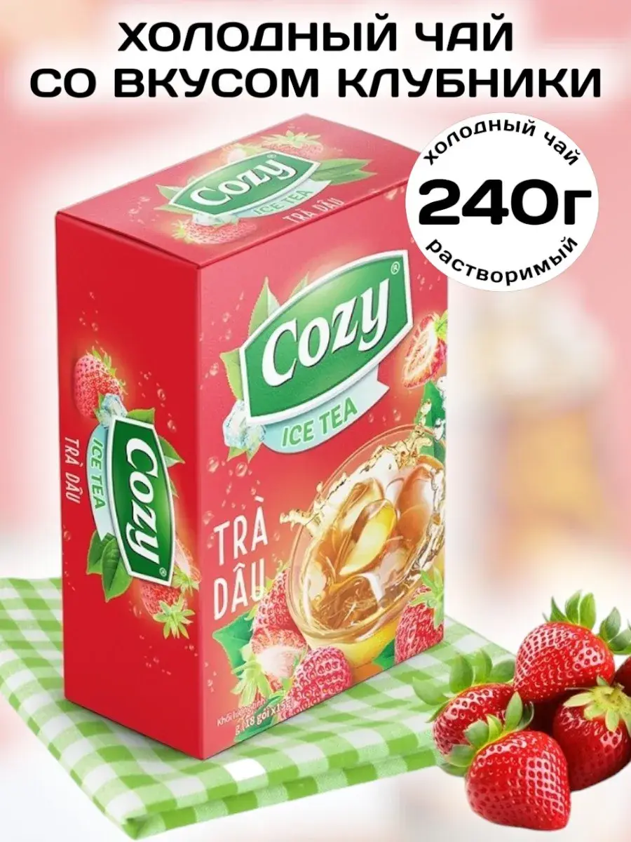 Откройте для себя утончённый вкус вьетнамского чая со вкусом освежающей клубники. Чай Cozy любим миллионами потребителей по всему миру за его уникальный аромат, вкус и настойку. Этот напиток создан, чтобы радовать вас в любое время дня. Вам понадобится всего 1 минута, чтобы приготовить уютный и ароматный чай. Положите 1 чайный пакетик в чашку, залейте 170 мл горячей (или холодной) воды, хорошо размешайте до растворения, по вкусу можно добавить кубики льда. В коробке 16 пакетиков по 15г.