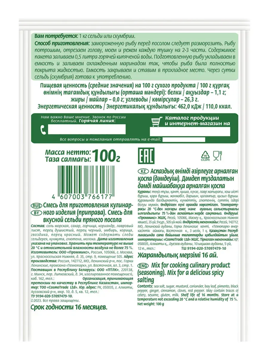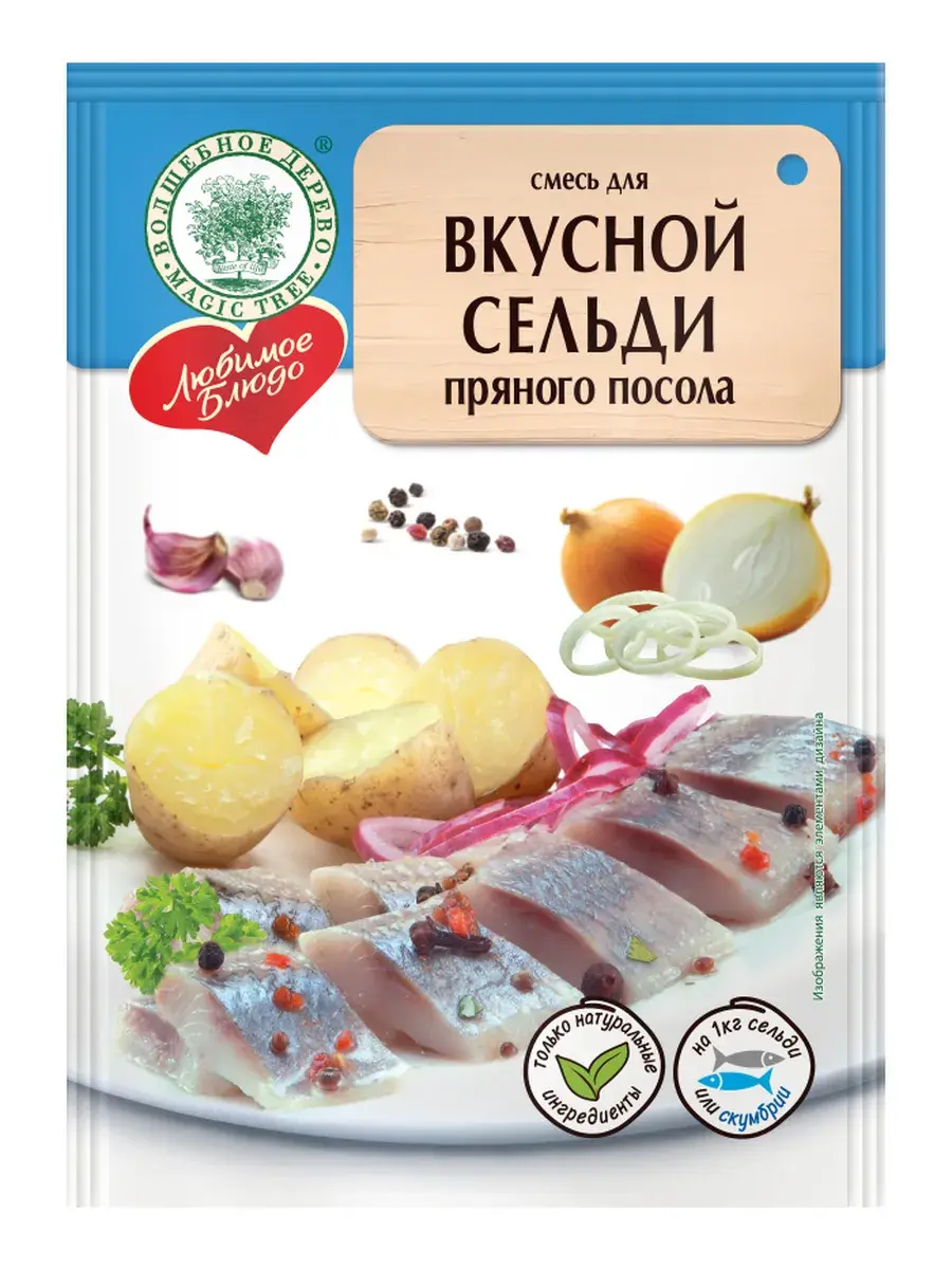 Сельдь – ценный и питательный продукт богатый жирными кислотами омега-3. Засолить селедку самостоятельно нетрудно, а готовая смесь специй поможет справиться с этим быстрее. Результат порадует вас неповторимым вкусом. Благодаря приготовлению в домашних условиях, можно контролировать процесс качества посола, степень солености и в итоге получить полезный продукт без консервантов. Первое, что нужно сделать – разморозить рыбу (1 кг сельди или скумбрии). Затем выпотрошить, отрезать голову, промыть прохладной водой, разрезать тушку на 2 части. Далее берем горячую кипяченую воду 0,5 л и заливаем содержимое пакета. Полученным охлаждённым маринадом покрываем сельдь так, чтобы рыба полностью была погружена в жидкость. Закрываем крышкой емкость и убираем в прохладное место. Через сутки засоленный продукт готов к употреблению. В комплекте 5 пакетиков по 100г.