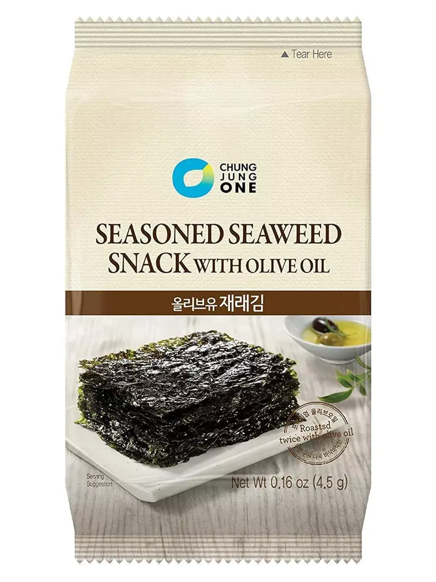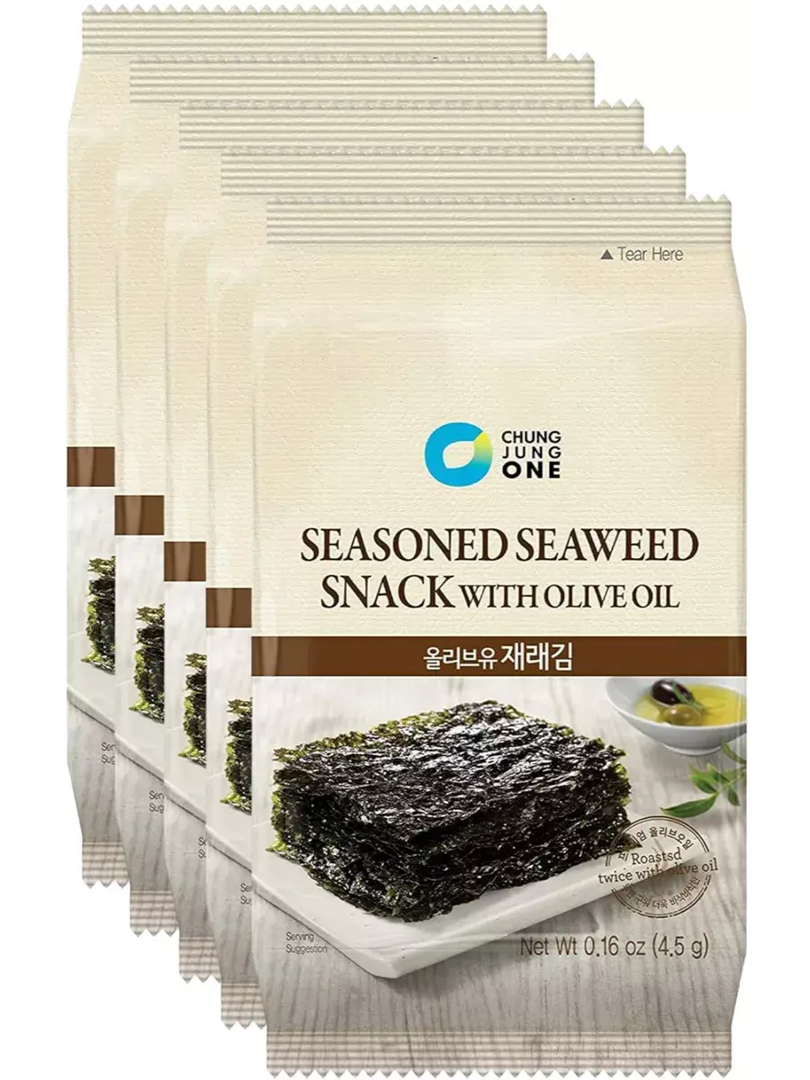Закуска из морских водорослей с оливковым маслом — это вкусная, хрустящая и пикантная закуска из морских водорослей. Двойная обжарка до совершенства с оливковым маслом для получения пикантной закуски. Это и вкусно, и полезно, и прекрасно сочетается со многими блюдами. Листья нори можно есть с рисом, посыпать супами и салатами или есть отдельно в качестве закуски. Морские водоросли содержат много витаминов и минералов. Продукт готов к употреблению, нужно просто открыть и наслаждаться натуральным вкусом. В комплекте 5 пачек по 4,5г.