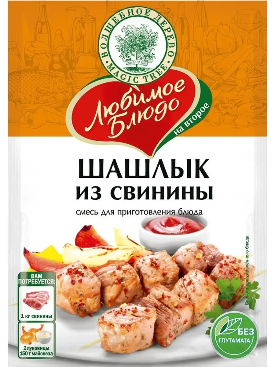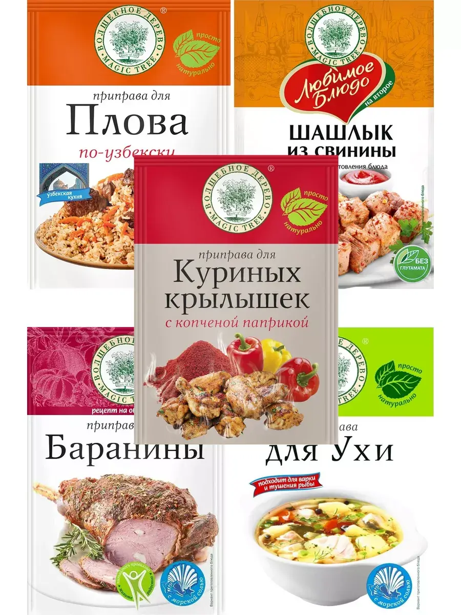 В комплекте ассорти 5 штук: Приправа для плова 25г; Шашлычок из свинины 30г; Приправа для баранины 30г; Приправа для ухи 30г; Приправа для куриных крылышек 25г.