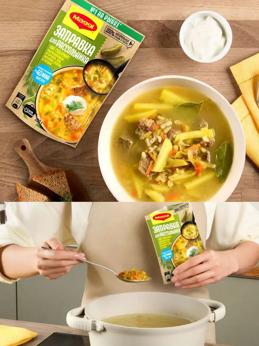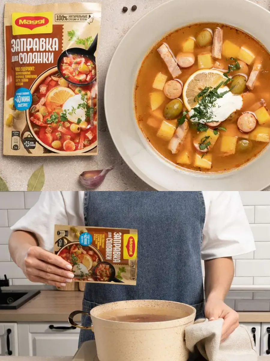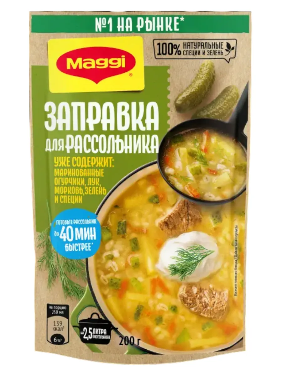 Домашний борщ без лишних хлопот это возможно! Заправка для борща поможет вам радовать семью любимым супом чаще. В ней уже содержатся тертая свекла, томатная паста, лук, морковь, душистые травы и специи. Всё бережно пастеризовано и герметично упаковано. Добавьте Заправку для борща в бульон с картофелем и капустой за 5 минут до готовности и ваш домашний фирменный борщ готов. 1 пачка рассчитана на 3л борща. А с MAGGI Заправкой для солянки вы сможете чаще радовать семью любимым вариантом супа без лишних усилий. MAGGI Заправка для солянки приготовлена из отборных овощей, с маринованными огурчиками, греческими оливками и душистыми специями. Заправка для рассольника поможет радовать семью вкусным и сытным Рассольником без лишних усилий. Заправка уже содержит маринованные огурчики, лук, морковь и другие овощи, бережно пастеризованных со специями и зеленью. Добавьте MAGGI в бульон с крупой и картофелем за 5 минут до готовности и ваш любимый рассольник готов.
