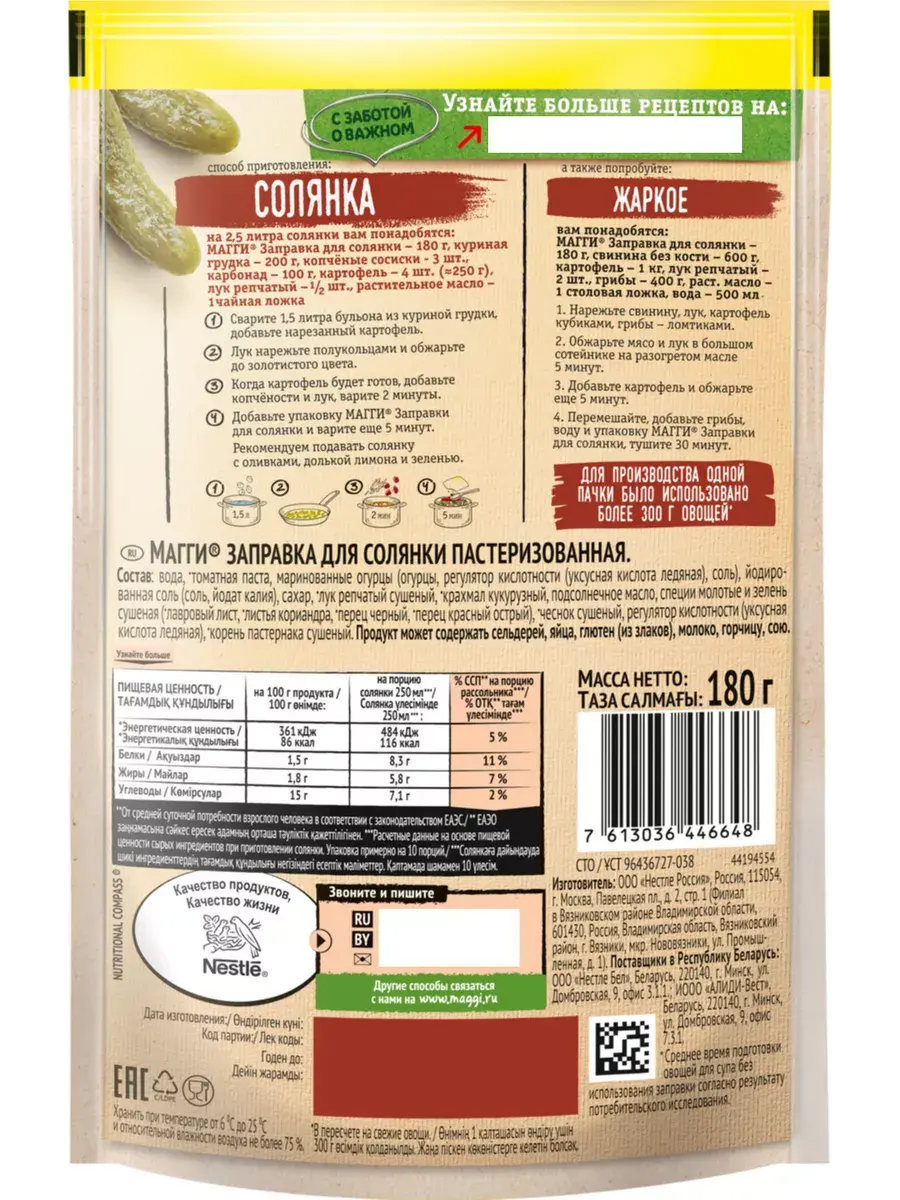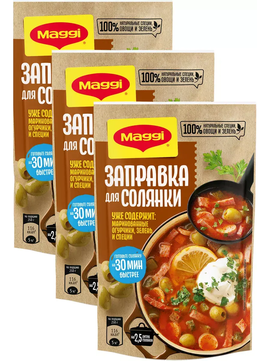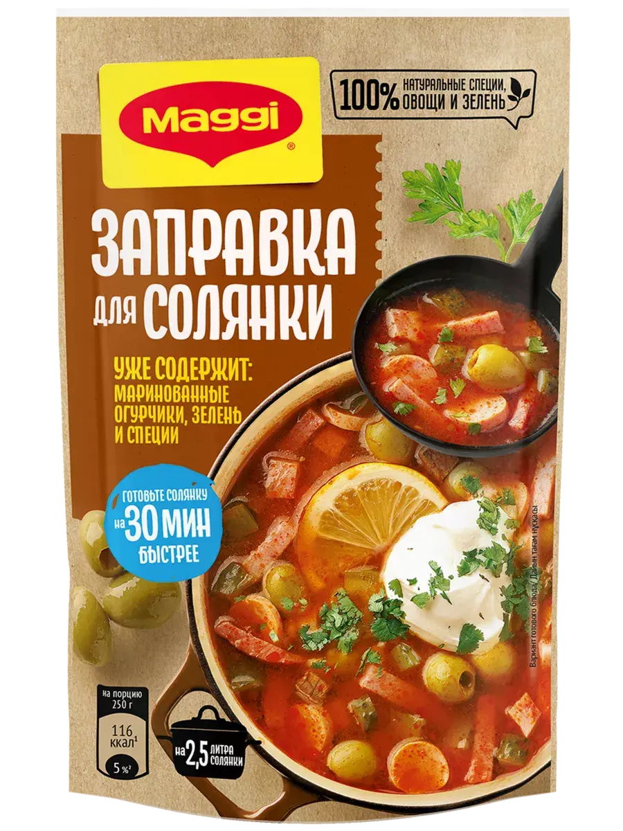 MAGGI Заправка для солянки приготовлена из отборных овощей, с маринованными огурчиками, греческими оливками и душистыми специями. Все ингредиенты бережно пастеризованы и герметично упакованы.