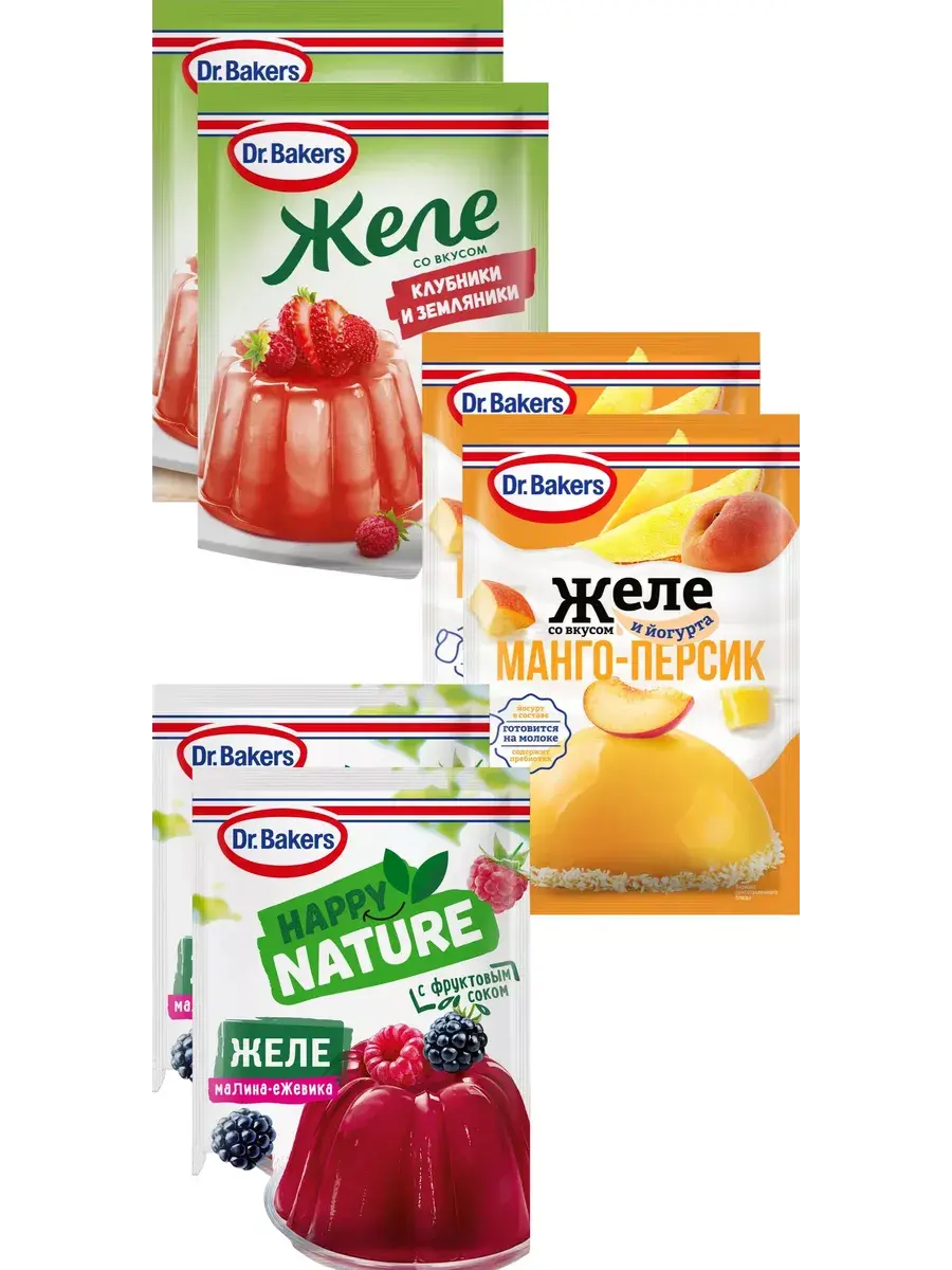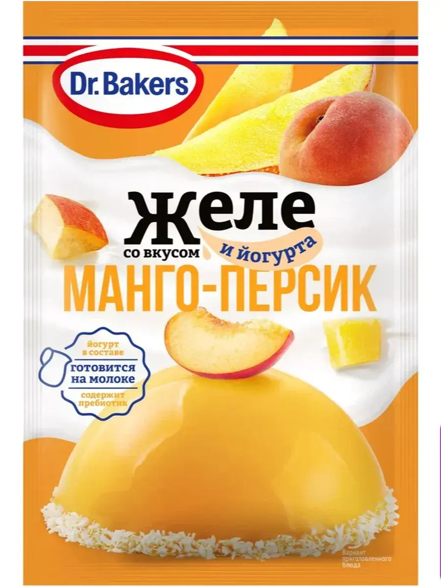 Желе со вкусом манго-персик и йогурт 33г. Представляем новую линейку желе со вкусом йогурта! Сочетание персика и манго придаёт десерту особенно нежный аромат и экзотический вкус. В составе пищевой пребиотик, сухой йогурт, натуральные красители и еще меньше сахара, по сравнению с классическим желе Dr. Bakers. Для приготовления понадобится 200 мл молока. Отлично сочетается с фруктами, ягодным соусом и взбитыми сливками.
