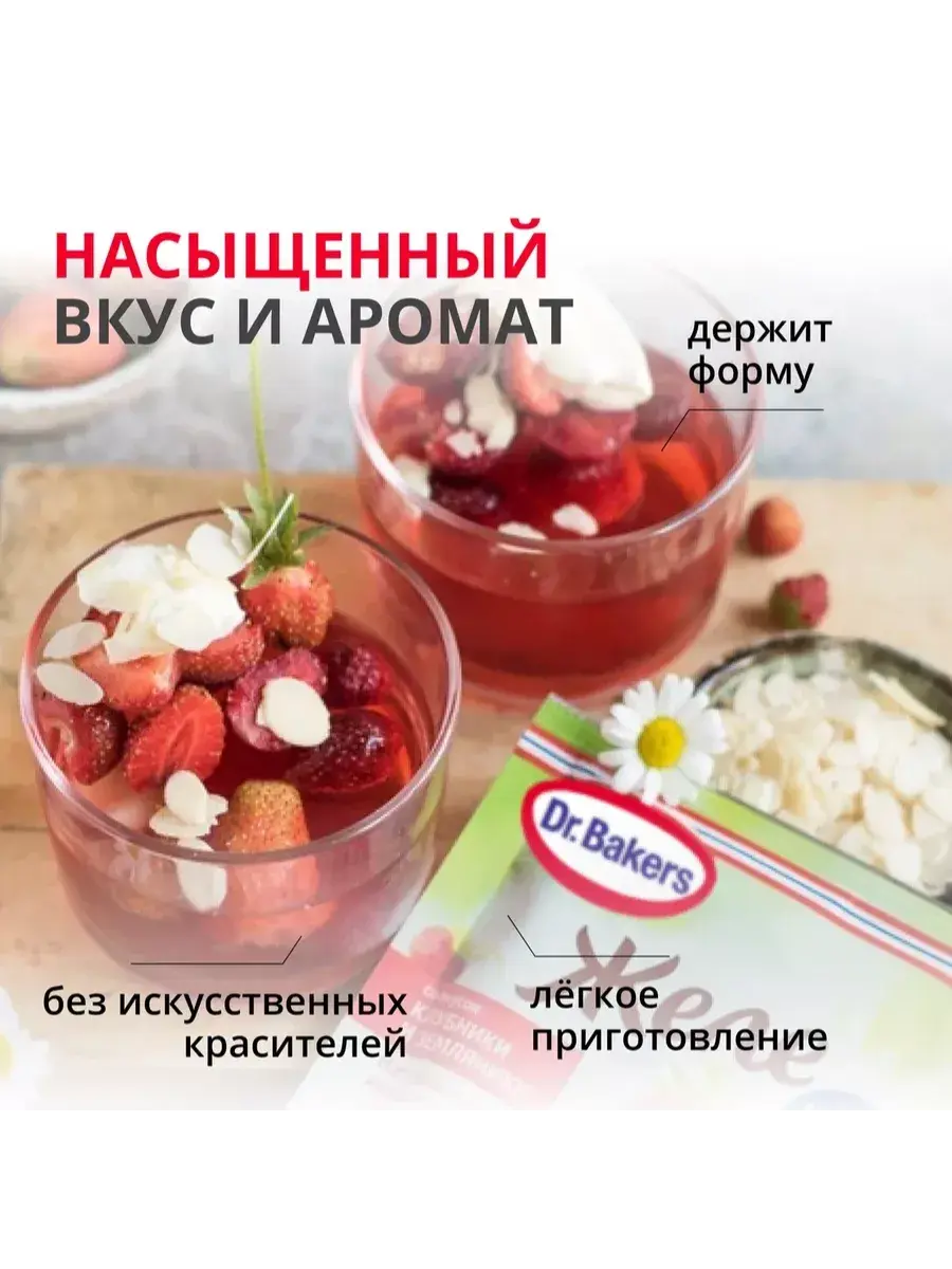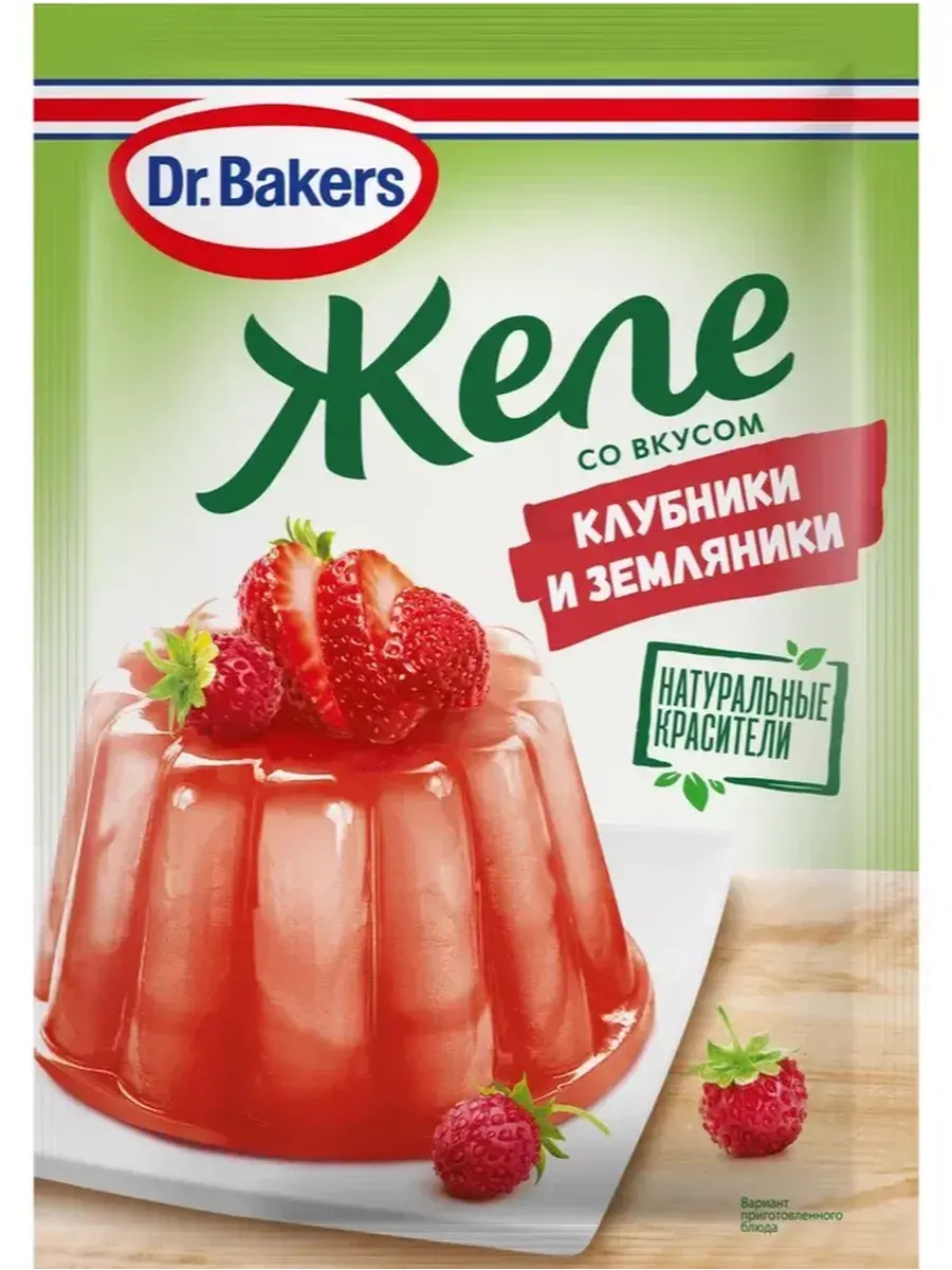 Желе со вкусом клубники и земляники 45г быстро застывает и сохраняет форму. Обладает ярким вкусом и цветом. Легко готовится с добавлением 200 мл воды и не требует добавления сахара. Можно приготовить многослойные десерты различной формы и удивить близких и друзей необычным угощением Натуральные красители в составе желе.