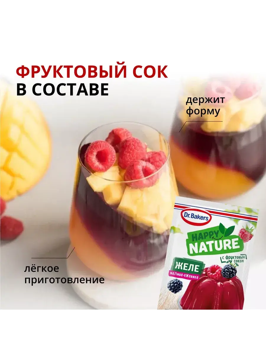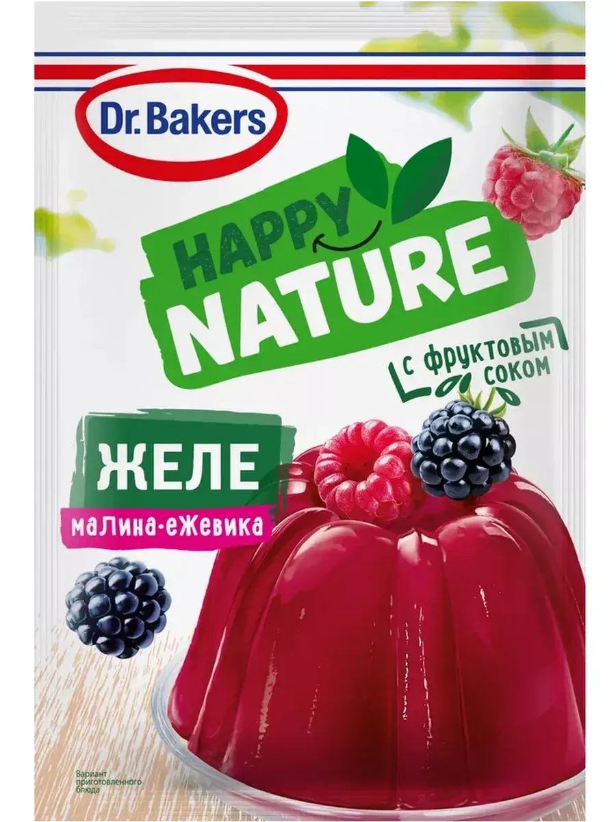 Желе со вкусом малина-ежевика 41г. Представляем новую линейку натурального желе – Happy Nature! Новые вкусы, яркие цвета, а в составе только натуральные компоненты (без искусственных красителей и ароматизаторов), фруктовый сок и еще меньше сахара, по сравнению с классическим желе Dr. Bakers.