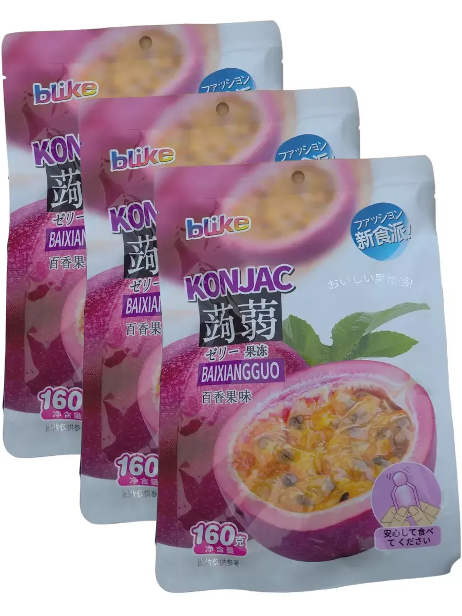 Мармеладное желе с конняку (конжаком) со вкусом маракуйи – низкокалорийный десерт на основе природного загустителя – высушенных и измельченных в пудру клубней азиатского растения конжака. На его основе изготавливают множество желеобразных десертов, так как он имеет ряд достоинств – в нем нет калорий, он содержит полезную для пищеварения клетчатку, значительно разбухает в желудке, вызывая чувство сытости и помогая бороться с голодом, имеет нейтральный вкус, что делает его идеальной основой для сладких десертов. Желе с конжаком почти не содержат калорий и не навредят фигуре. В охлажденном виде лакомство еще вкуснее. В комплекте 3 пачки по 160г.