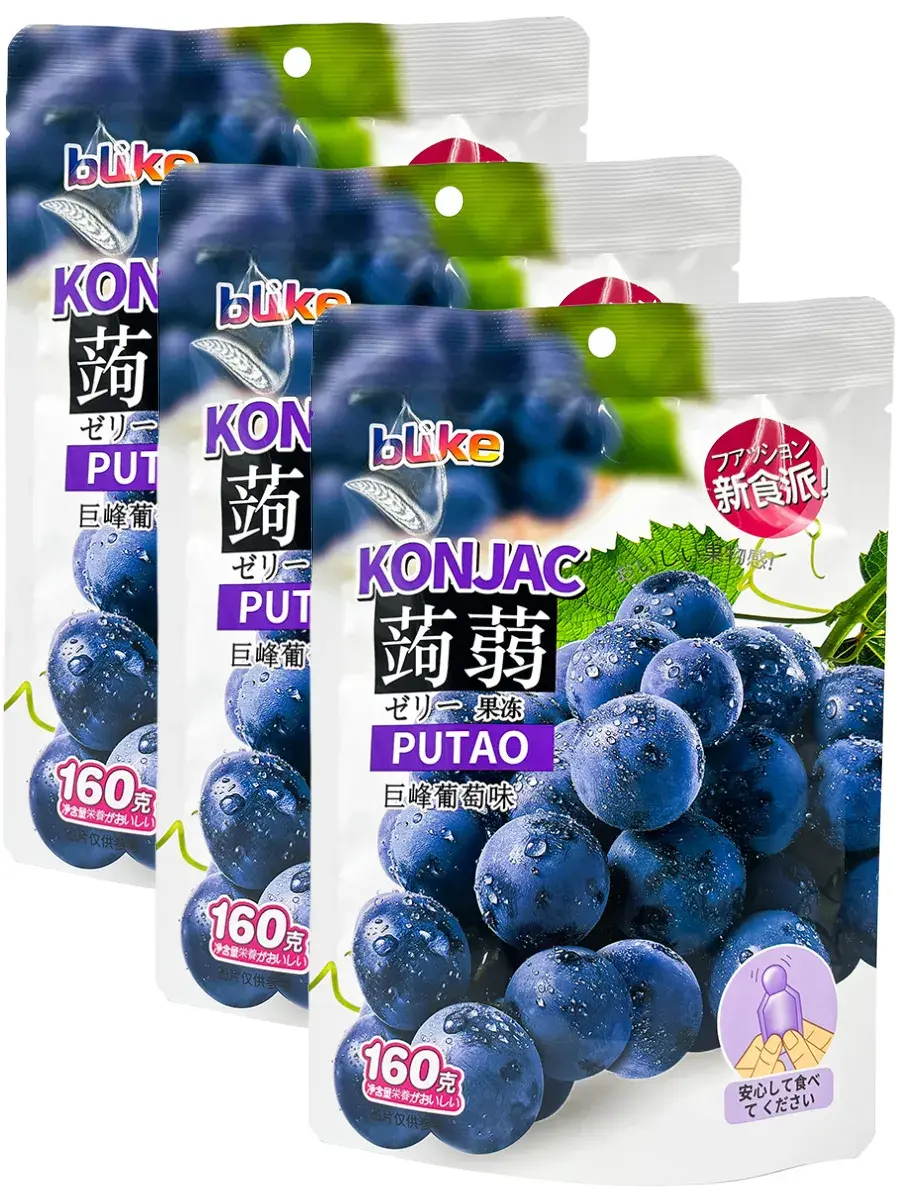 Мармеладное желе с конняку (конжаком) со вкусом винограда – низкокалорийный десерт на основе природного загустителя – высушенных и измельченных в пудру клубней азиатского растения конжака. На его основе изготавливают множество желеобразных десертов, так как он имеет ряд достоинств – в нем нет калорий, он содержит полезную для пищеварения клетчатку, значительно разбухает в желудке, вызывая чувство сытости и помогая бороться с голодом, имеет нейтральный вкус, что делает его идеальной основой для сладких десертов. Желе с конжаком почти не содержат калорий и не навредят фигуре. В охлажденном виде лакомство еще вкуснее. В комплекте 3 пачки по 160г.