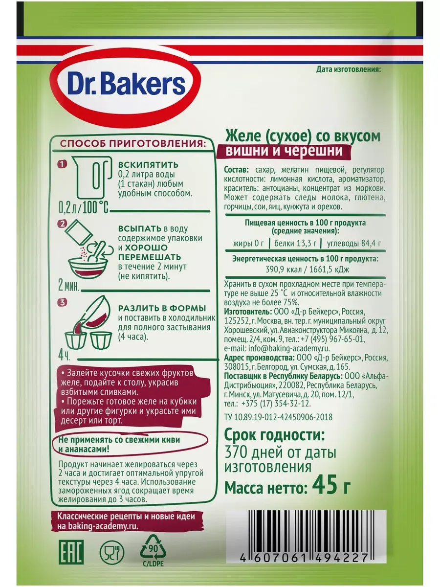 «Желе со вкусом вишни и черешни» Dr. Bakers 45г отличает яркий дуэт двух вкусов и насыщенный цвет. Желе быстро застывает и отлично держит форму. Легко готовится с добавлением 200 мл воды и не требует добавления сахара. Можно приготовить многослойные десерты различной формы и удивить близких и друзей необычным угощением Натуральные красители в составе желе.