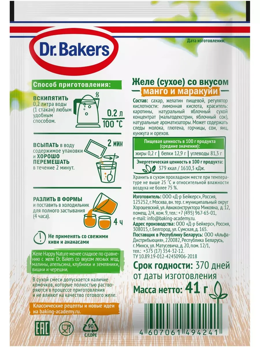 Представляем новую линейку натурального желе – Happy Nature манго-маракуйя 41г! Новые вкусы, яркие цвета, а в составе только натуральные компоненты (без искусственных красителей и ароматизаторов), фруктовый сок и еще меньше сахара, по сравнению с классическим желе Dr. Bakers.