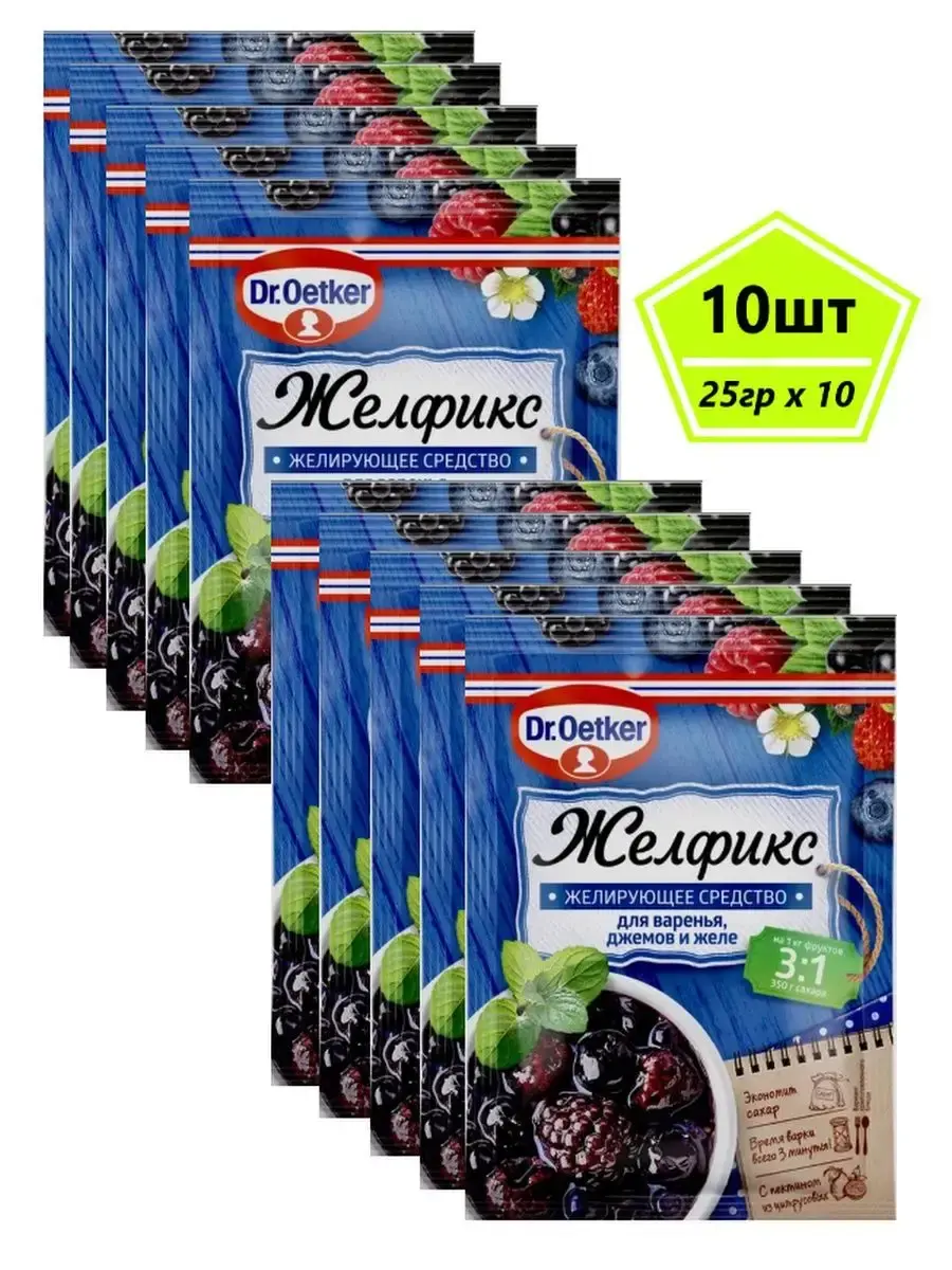 Желфикс 3:1. Универсальное средство для приготовления варенья и джемов на основе пектина - натурального желирующего компонента, при добавлении которого варенье приобретает приятную джемовую консистенцию. С “Желфикс 3:1” вы экономите сахар, добавляя лишь 350 г сахара на 1 фруктов и ягод. Используя продукт “Желфикс”, варенье нужно варить не более 3х минут после закипания, в результате чего фрукты и ягоды сохраняют свой натуральный вкус и цвет. 1 упаковка рассчитана на 1 кг фруктов и всего 350 г сахара.