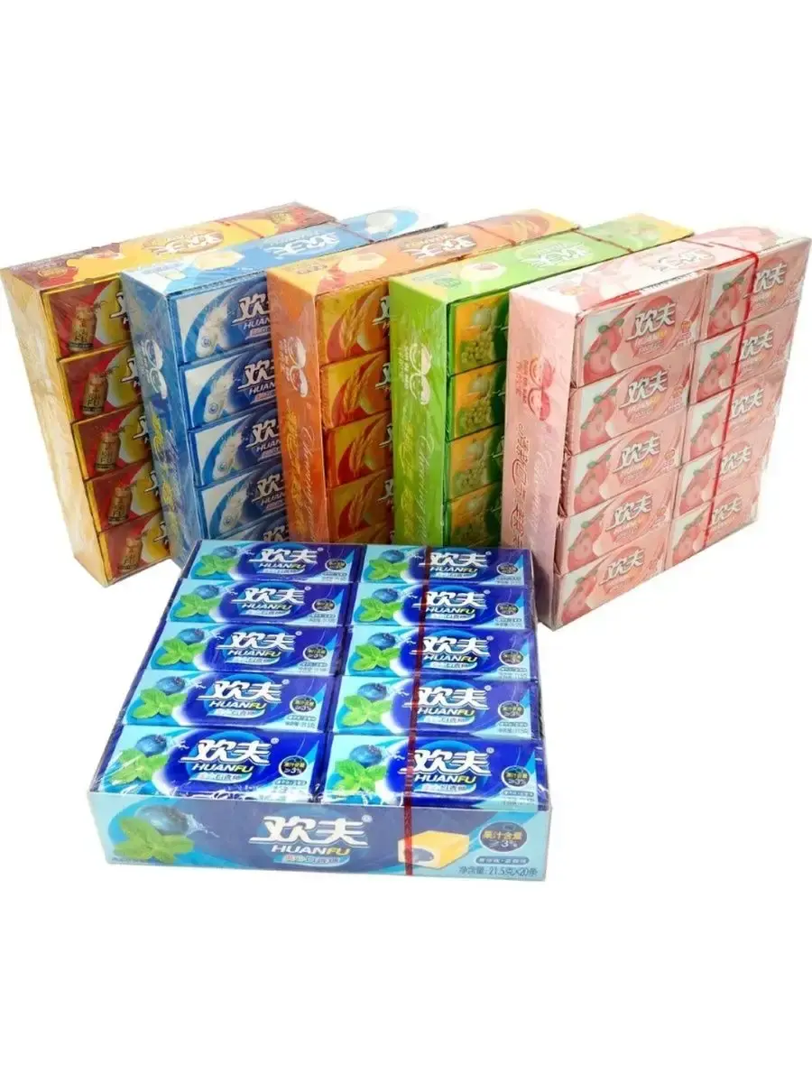 Жевательная резинка 5 разных вкусов «HUANFU» с разнообразной начинкой понравится и взрослым и детям. Она долго сохраняет насыщенный вкус и не теряет эластичность. Из этой жевательная резинки хорошо надуваются пузыри, что делает ее не только лакомством, но и увлекательным развлечением.