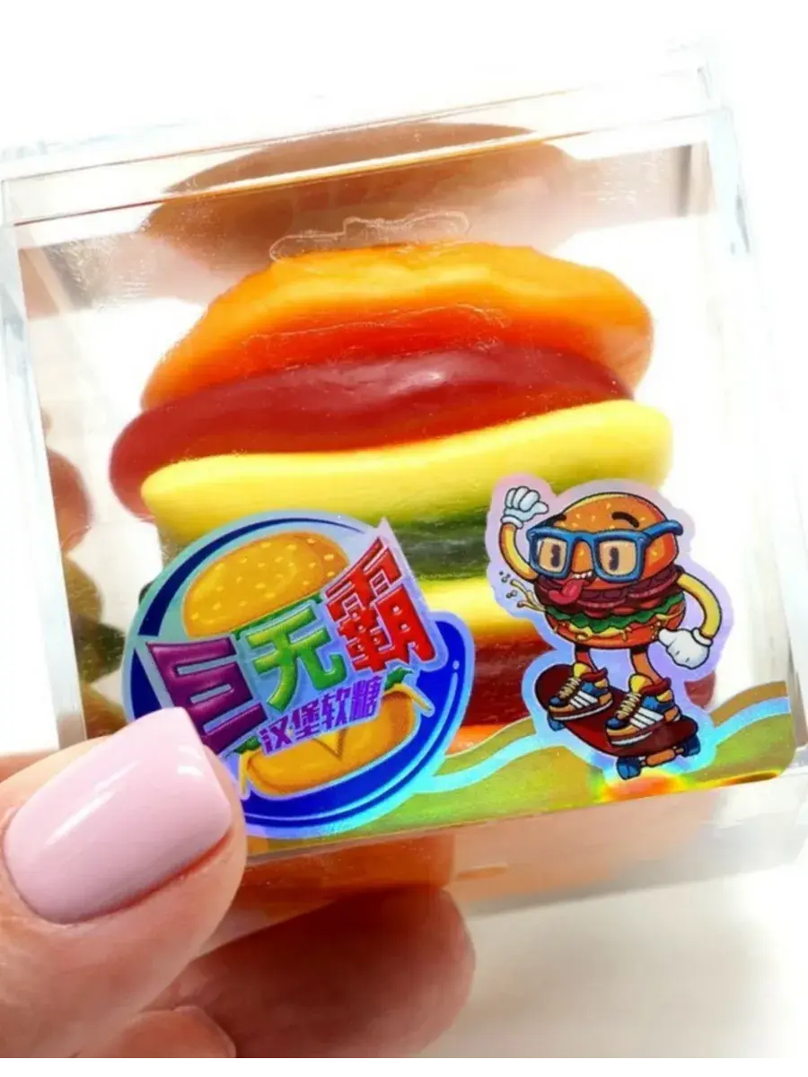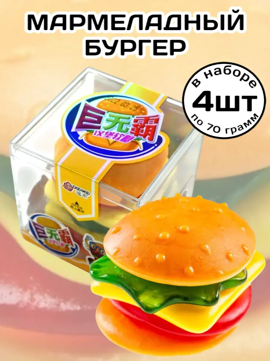 Представляем твою новую сладкую фантазию — большой бургер из жевательного мармелада! Этот мармелад не просто лакомство — это настоящее приключение вкуса: сочные «булочки» с нежным ванильно-кремовым ароматом, яркие «котлетки», хрустящая «капуста» и «сыр». Каждая порция — как маленькая вечеринка: бери между пальцами, разминай, жуй и наслаждайся взрывом текстур и оттенков. Мармеладный бургер — отличный повод удивить друзей, устроить сладкий сюрприз или добавить ярких красок в любое настроение. Он такой большой, что хватит на всех! Сочный, яркий, необычный — этот мармелад-бургер станет звездой любого праздника и поднимет настроение с первого укуса!