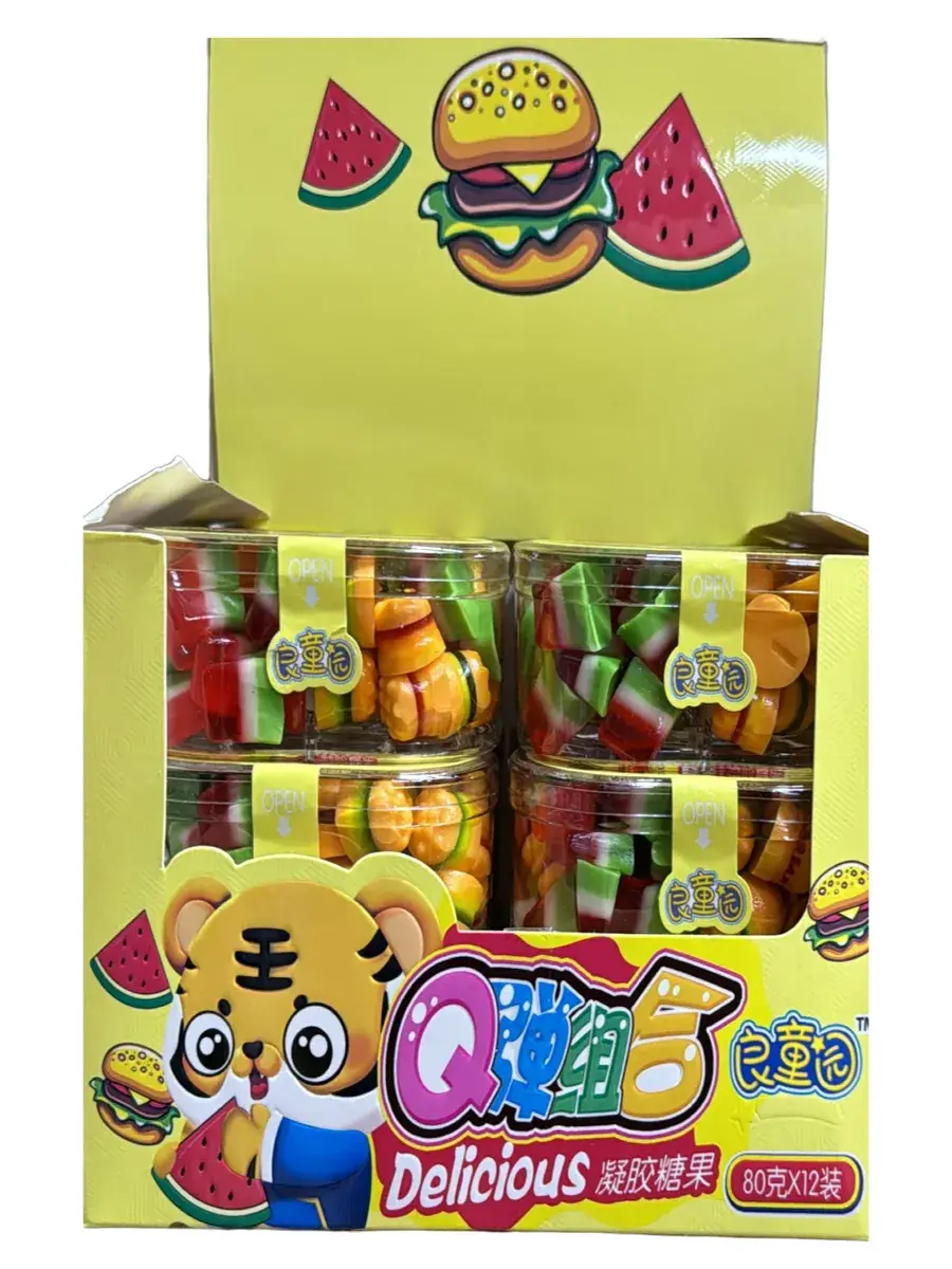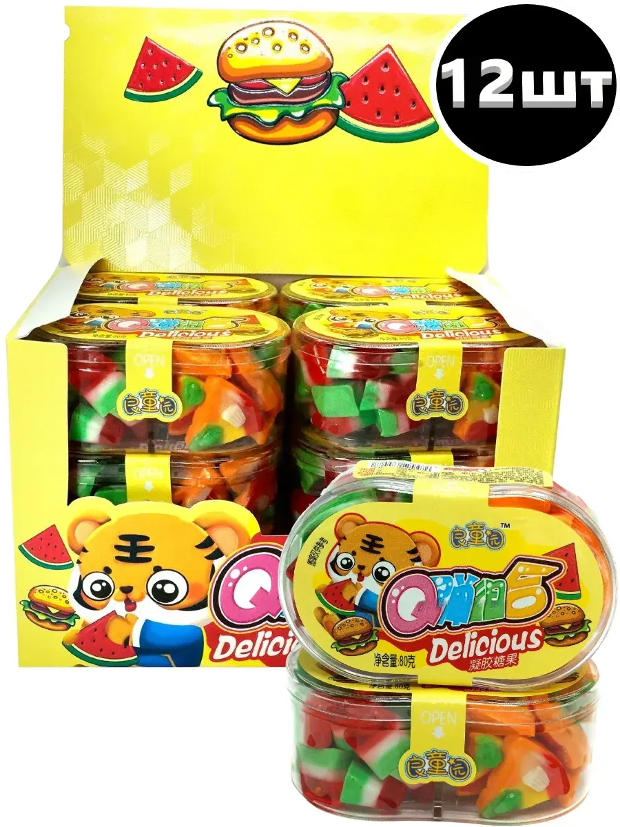 Мармелад для тех, кто любит вкусно и с юмором! Сочные арбузные дольки и забавные мини-бургеры — это не только вкусно, но и весело! Настоящий праздник для любителей необычных сладостей. Каждая упаковка наполнена яркими фруктовыми вкусами и порадует как детей, так и взрослых. Почему бы не сделать ваш день немного веселее? Фруктовая сочность и аппетитный вид подарят радость каждому, кто решится попробовать. Будьте готовы к сладкому удивлению — откройте упаковку и наслаждайтесь! В блоке 12 упаковок по 80г.