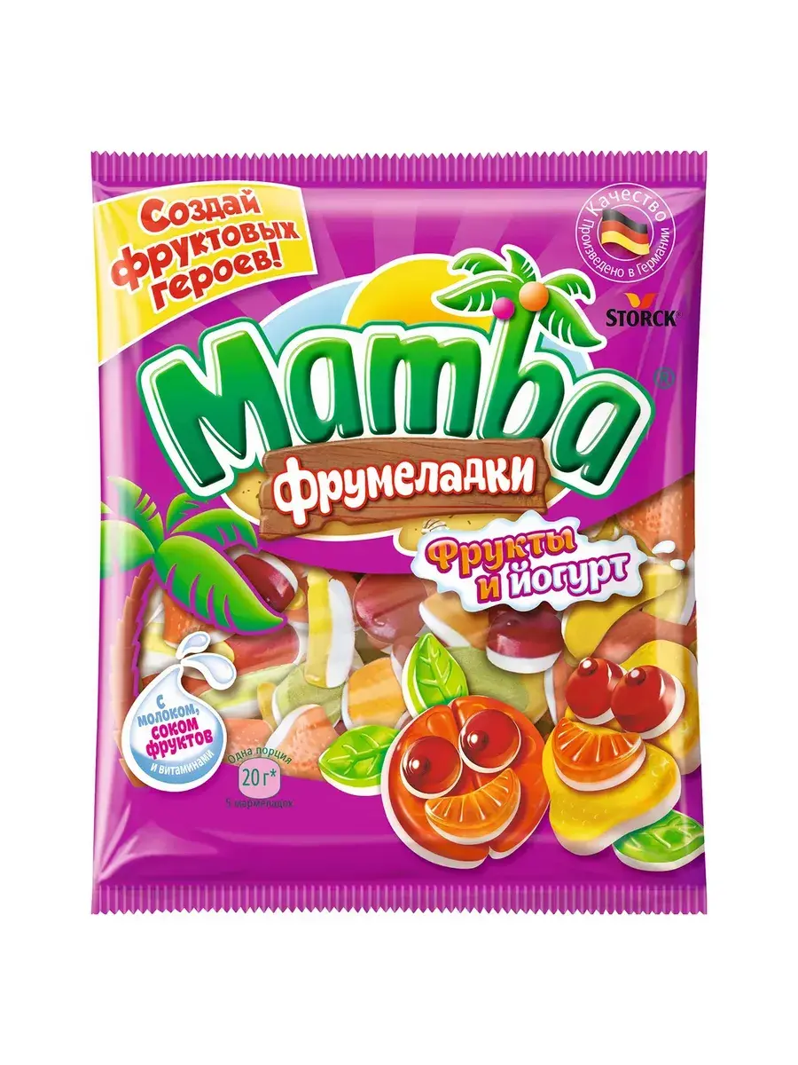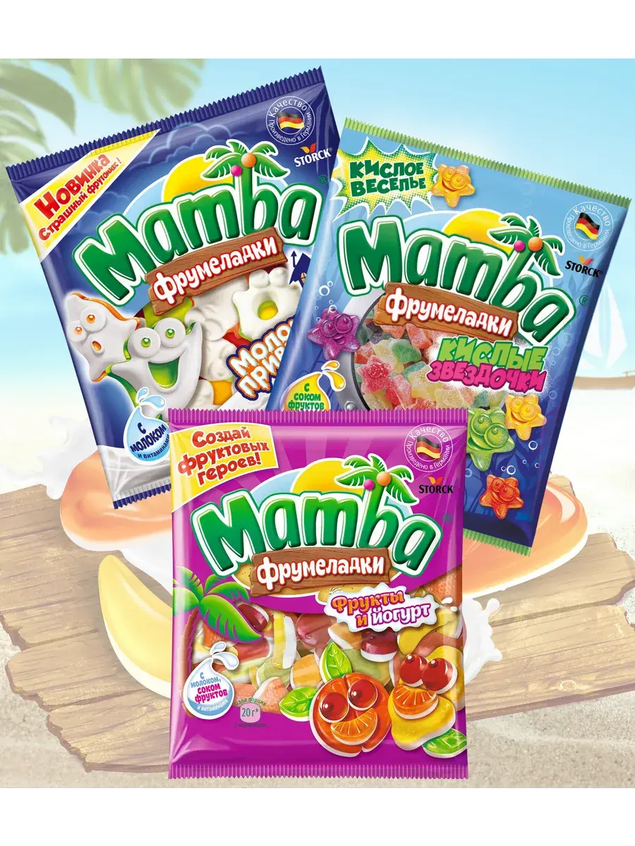 Молочные Приведения – это яркое ассорти фруктовых вкусов, созданное для веселья! С этими привидениями можно не только вкусно перекусить, но и придумать захватывающие игры. Кислые Звездочки подарят взрывной вкус и заряд радости. Этот жевательный мармелад с фруктовым соком и витаминами объединяет насыщенные фруктовые оттенки с приятной кислинкой, создавая идеальное сочетание. Mamba Фрумеладки «Фрукты и йогурт» – жевательный мармелад с нежным йогуртовым слоем, обогащенный витаминами! Яркие фруктовые вкусы в сочетании с мягкой текстурой дарят настоящее удовольствие. Дети смогут не только наслаждаться отличным вкусом, но и создавать свой удивительный мир фруктовых героев Mamba, собирая мармеладки разных форм и превращая их в новых весёлых персонажей. В наборе 3 пачки ассорти видов.