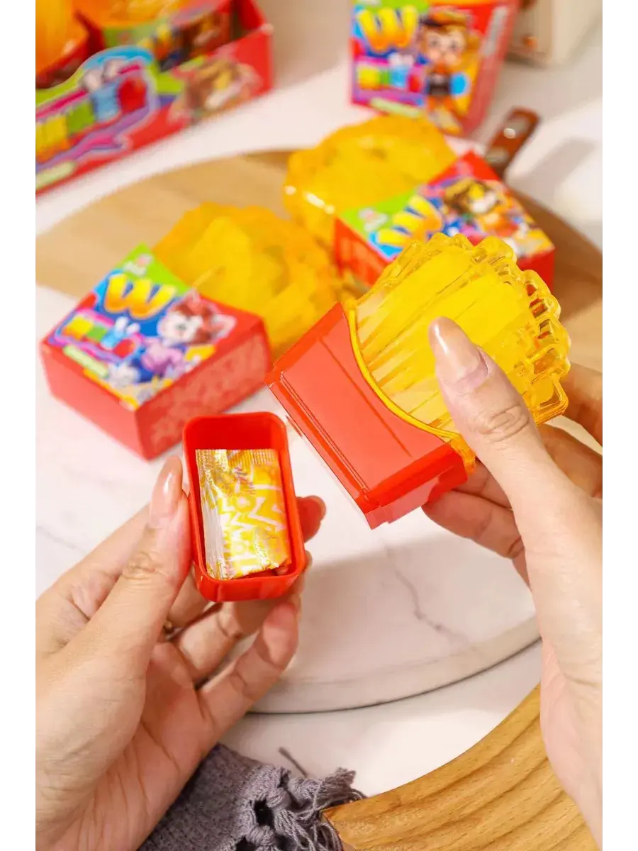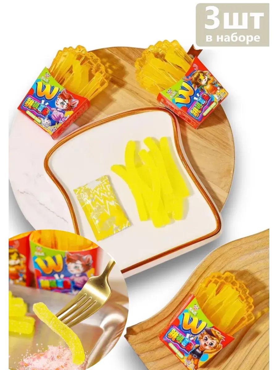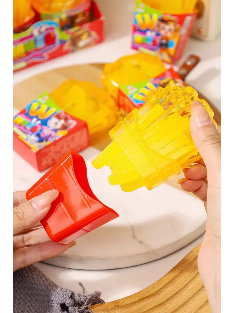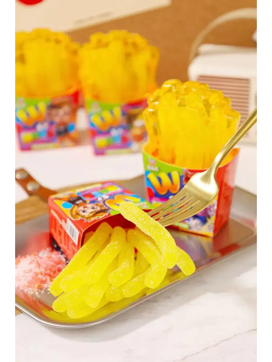 Жевательный мармелад в виде картофеля фри - идеальное лакомство для всех любителей популярной закуски! Мармелад очень точно повторяет внешний вид и текстуру картошки. Этот жевательный картофель фри станет отличным десертом на вечеринке или просто вкусным угощением для всей семьи. Сочная, мягкая, и тающая во рту — удивит каждого. Сюрприз внутри — шипучая конфета! Она взрывается на языке и добавляет яркие эмоции! Идеально для перекуса или в подарок, который гарантированно вызовет улыбку. Попробуй сам, и дай друзьям шанс угадать, что это за фастфуд на вкус! С этими жевательными "фри" можно наслаждаться моментом без капли жира, зато с максимальной дозой веселья. В комплекте 3 штуки по 65г.