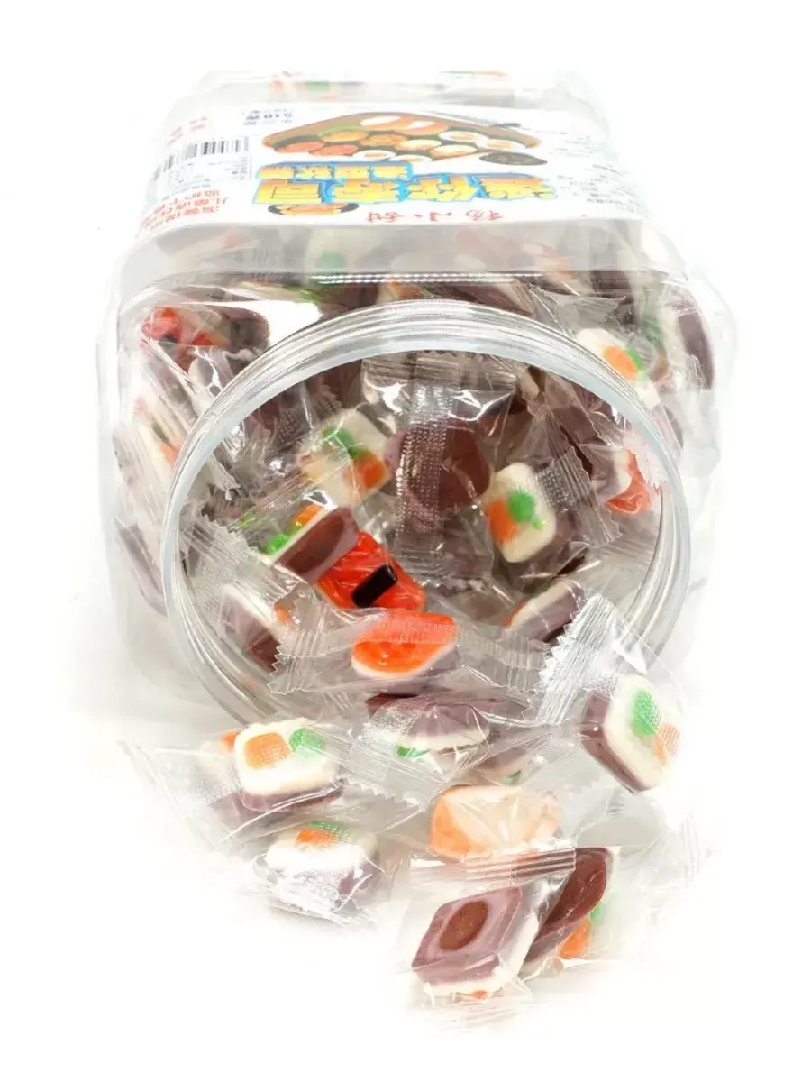 Жевательный мармелад самой необычной формы украсит любой праздник, поднимет настроение детям, взрослым и понравится всем любителям азиатских сладостей! Удивите друзей и близких красивыми и вкусными сладостями в виде любимого блюда фанатов азиатской кухни. Такие мармеладки в виде суши и ролов захочется есть снова и снова. Настоящие суши предпочитают далеко не все, а вот сладкие, мармеладные, с фруктовыми вкусами захотят продегустировать все! В банке 70 индивидуальных упаковок по 7 грамм, чтобы каждый мог насладиться необычным лакомством. В комплекте одна пластиковая банка-блок, весом 490 грамм.