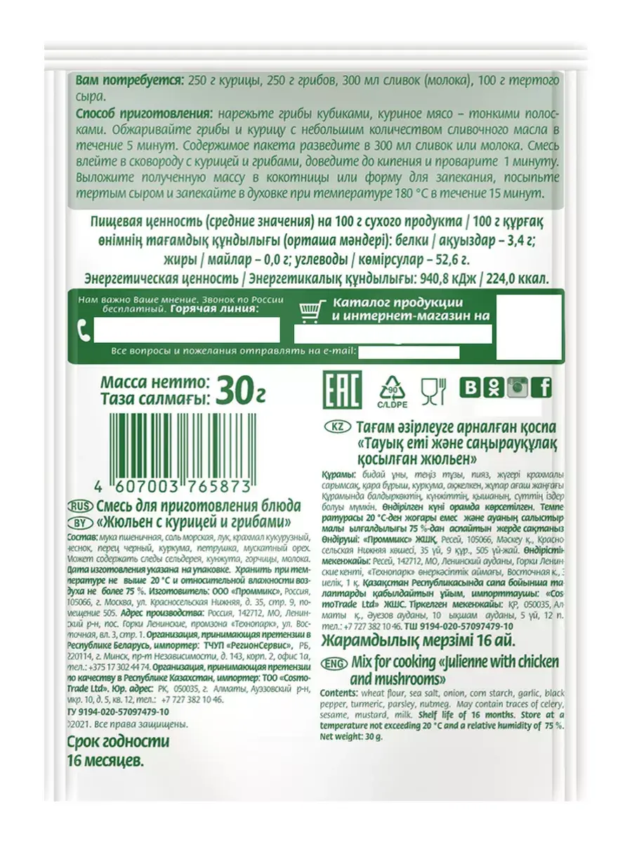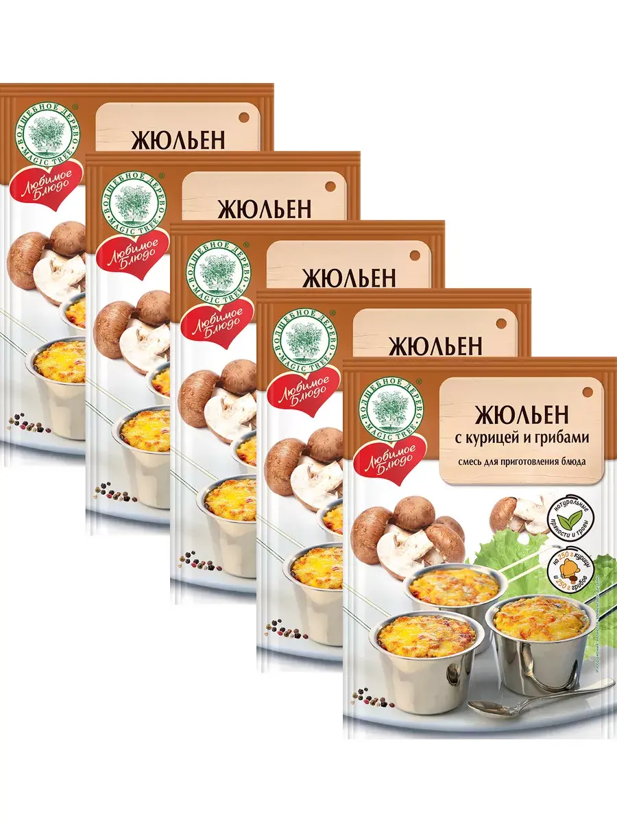 Приготовить ароматный жюльен с курицей и грибами стало проще простого! Смесь соли, чеснока, черного перца, петрушки и мускатного ореха подарит блюду неповторимый аромат и пряный вкус. Удобная подача в горшочках превращает это блюдо из праздничной закуски во вполне полноценный ужин. В комплекте 5 штук по 30 грамм.